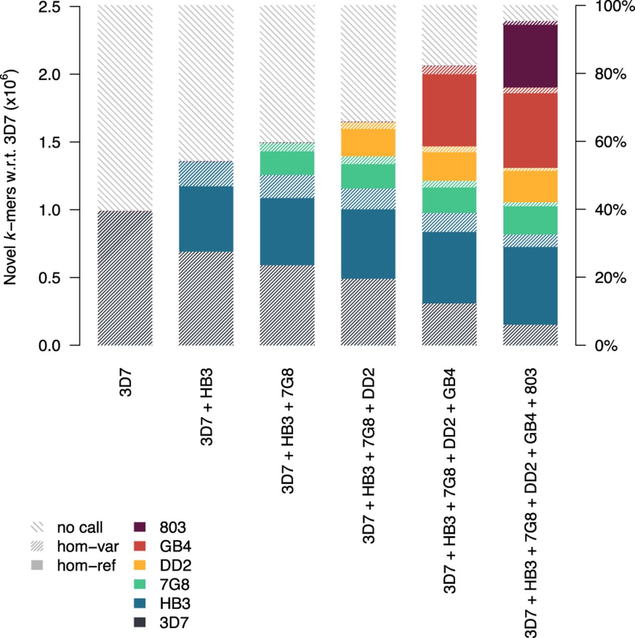 Calls tagged by 36F11 k-mers novel with respect to 3D7, redescribed against combinations of other reference sequences. Stacked bars represent fraction of novel k-mers linked to homozygous-reference (hom-ref) and homozygous-variant (hom-var) calls or of k-mers where no call could be made. Colors represent the specific haplotypic background the call was placed on (if a call can be equally described on multiple backgrounds, one is chosen at random).
