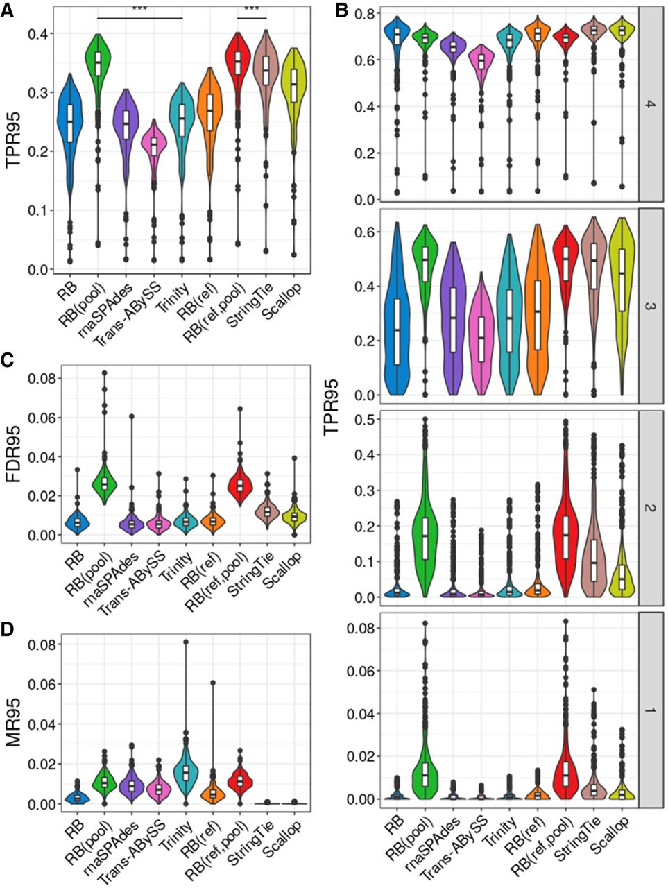 Assembly quality on simulated data for 384 mouse cells. (A) True positive rate calculated based on isoforms reconstructed to at least 95% of annotated length, denoted as TPR95. (B) True positive rate at different transcript expression stratum. (C) False-discovery rate calculated based on isoforms reconstructed to at least 95% of annotated length, denoted as FDR95. (D) Misassembly rate calculated based on isoforms reconstructed to at least 95% of annotated length, denoted as MR95. Distributions of each metric were measured over all 384 cells. The comparison bars on top between RB(pool) and RB(ref,pool) and the next best performer in each class indicate statistical significance of the difference between distributions at P < 0.001 (***) or no significance (NS) using the Wilcoxon test.