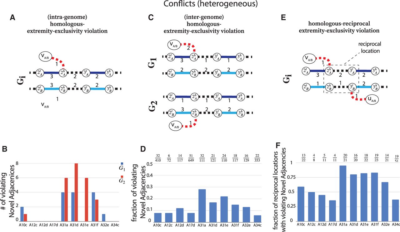 (in different genomes) must be involved in novel adjacencies. (D) The fraction x/y, where x is the number of novel adjacencies that violate the inter-genome homologous-extremity-exclusivity constraint (on at least