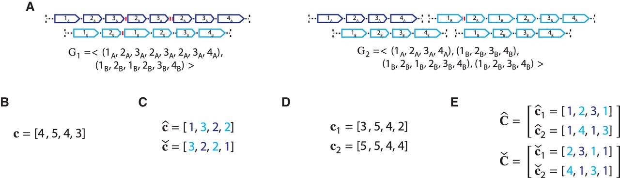 Ambiguity and errors in inferring segment copy number (SCN) profiles for a heterogeneous sample S = (G1, G2) under different assumptions about the sample composition. (A) A two-genome proper sample S = (G1, G2): each genome Gi ∈ S is depicted as collections of adjacent blocks (top), and the corresponding sequences of signed blocks (bottom). (B) The copy number profile c = [c1, c2, c3, c4] inferred under the assumption that the sample is homogeneous (i.e., comprised of a single derived genome) and the reference