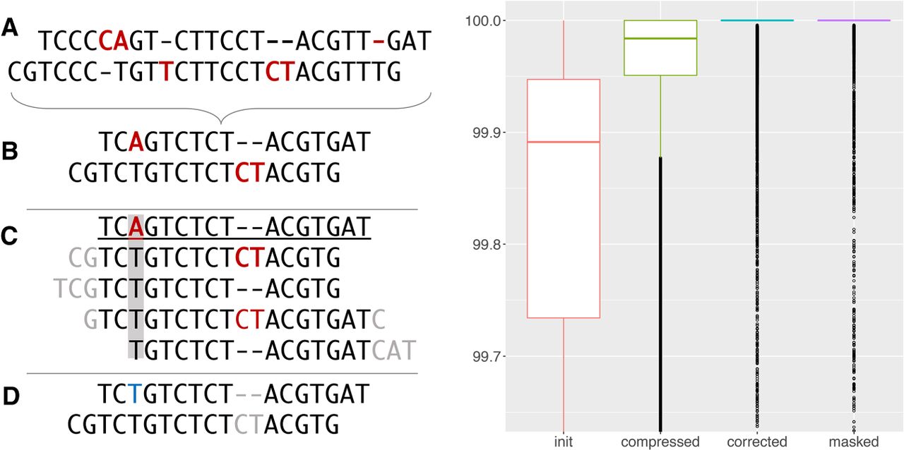 Impact of HiCanu processing on observed read quality. (A) Two hypothetical reads are shown with sequencing errors highlighted in red. (B) The first step of HiCanu is to compress homopolymers, which obscures homopolymer length errors but retains enough information to accurately distinguish reads from different genomic loci. (C) Overlaps are then computed for the compressed reads, and remaining errors are identified by examining the alignment pileups (gray rectangle). (D) Finally, after correcting the identified errors (blue) and ignoring indels in regions of known systematic error (gray), the resulting overlap is 100% identical. (Right) Sequence identity of reads from a 20-kbp HiFi library measured against the CHM13 Chromosome X reference sequence v0.7 (Miga et al. 2020) after each step of HiCanu processing (Supplemental Note 1). Separate boxplots are shown for initial raw HiFi reads (init), homopolymer-compressed reads (compressed), OEA-corrected reads (corrected), and corrected reads after ignoring differences in microsatellite repeats (masked). The median read identity, indicated by solid segments, increases from <99.9% to 100% (note the plot shows y-range of 99.65%–100%). Supplemental Table S1 also shows how HiCanu processing increases the percentage of perfectly aligned (100% identity) HiFi reads from <1% to >97%.
