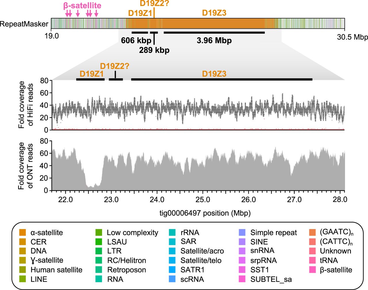 HiCanu assembly of the CHM13 Chromosome 19 centromere. RepeatMasker (Smit et al. 2013) of tig00006497 reveals three α-satellite HOR arrays that reside within the Chromosome 19 centromere (D19Z1, D19Z2?, and D19Z3; marked with black bars). These HOR arrays are 606 kbp, 289 kbp, and 3.96 Mbp in length, respectively, and are composed of a 13-mer, a complex higher-order HOR, and a dimeric HOR unit, respectively. The HOR repeat underlying D19Z2 shares limited sequence identity with the pG-A16 repeat previously described (Hulsebos et al. 1988; Choo et al. 1991; Finelli et al. 1996) and, therefore, is designated with a question mark. The α-satellite HOR arrays have relatively uniform coverage of HiFi and ultralong Oxford Nanopore data, except for a drop in Oxford Nanopore sequencing coverage over the D19Z1 array, which may be owing to a misassembly, read mismapping, or biases in sequencing. The HiFi coverage plot shows fold coverage of the most common base (black) and the second most common base (red).