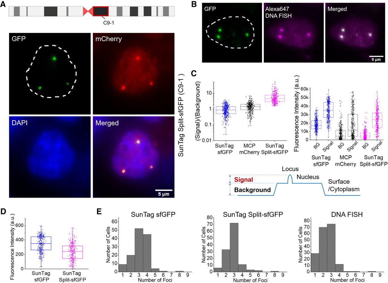 SunTag split-sfGFP CRISPR system reveals target-specific foci with high S/B. (A) C9-1 region observed in a fixed stable AD-293 cell line expressing the SunTag split-sfGFP CRISPR system. Schematic shows the location of the C9-1 loci on Chromosome 9. (B) Simultaneous CRISPR and DNA FISH imaging of the C9-1 loci to verify the colocalization of GFP foci and DNA FISH foci. (C) Comparison of signal, background, and S/B in C9-1 region observed with SunTag sfGFP, MCP-mCherry, and SunTag split-sfGFP systems. BG stands for background. Schematic shows how S/B was defined from the images. (D) Distribution of fluorescence signal intensity of the detected C9-1 foci in fixed stable AD-293 cell lines expressing the SunTag sfGFP or SunTag split-sfGFP systems. (E) Histograms of the number of C9-1 foci detected with different labeling schemes.