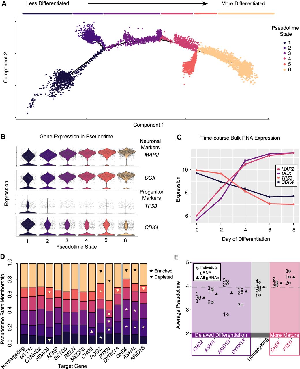 Pseudotime analysis reveals ASD-gene repression–induced alterations in differentiation trajectory and modules of ASD genes delaying or accelerating neuronal differentiation. (A) Pseudotime ordering of all single cells reveals a continuous trajectory of cell states corresponding to neuronal differentiation. Line segments along the trajectory are called “pseudotime states,” and cells are colored by these states. (B) Neuronal markers (MAP2 and DCX) increase along the pseudotime trajectory, whereas progenitor markers (TP53 and CDK4) decrease. (C) These marker genes show correlated patterns in time course bulk RNA expression. n = 2 replicates for each time point. Expression values, mean ± SEM. (D) Repression of some genes alter pseudotime state membership proportions. Significant enrichments and depletions are marked with asterisks and triangles, respectively (χ-squared test, P < 0.05). (E) Significantly decreased or increased average pseudotime scores relative to cells with nontargeting gRNAs (t-test, P < 0.01) indicate delayed or accelerated neuronal maturation. Boxed in purple is a set of ASD genes that delay neuronal differentiation by this metric. Boxed in red is a pair of genes, CHD8 and PTEN, that promote neuronal maturation. Overall (all gRNAs) and individual gRNA estimates of pseudotime are shown. Individual gRNAs numbers for each gene are indicated.