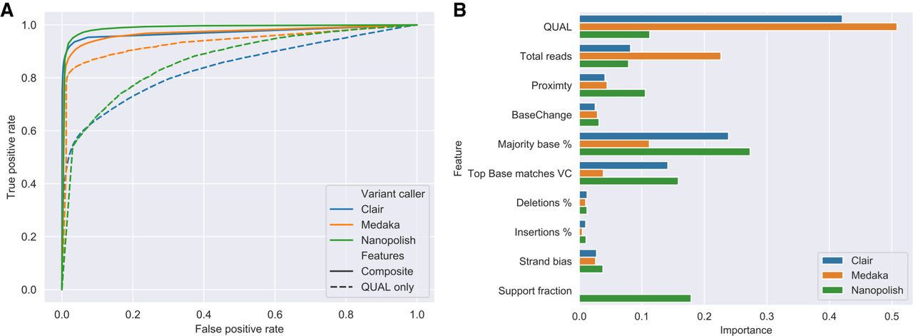 Random forest–based variant filtering using Nanopolish, Medaka, and Clair. (A) Receiver operating characteristic (ROC) curve for random forest classifier using different features including Quality (QUAL only, dashed line) and a composite selection of input features (Composite, solid line) for Nanopolish (green), Medaka (orange), and Clair (blue). AUC for each variant caller: Nanopolish 0.86 to 0.98, Medaka 0.93 to 0.97, Clair 0.84 to 0.97, using QUAL and Composite features, respectively. (B) Bar chart of feature importance for composite selection of features used to train the classifier.