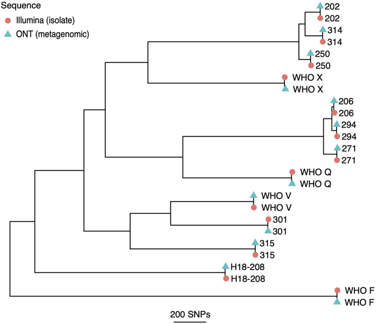 Recombination-corrected maximum likelihood tree of metagenomic Nanopore and paired Illumina isolate sequences. All Nanopore consensus sequences were generated from metagenomic sequencing with the exception of H18-208 and WHO Q, which were sequenced from isolates.