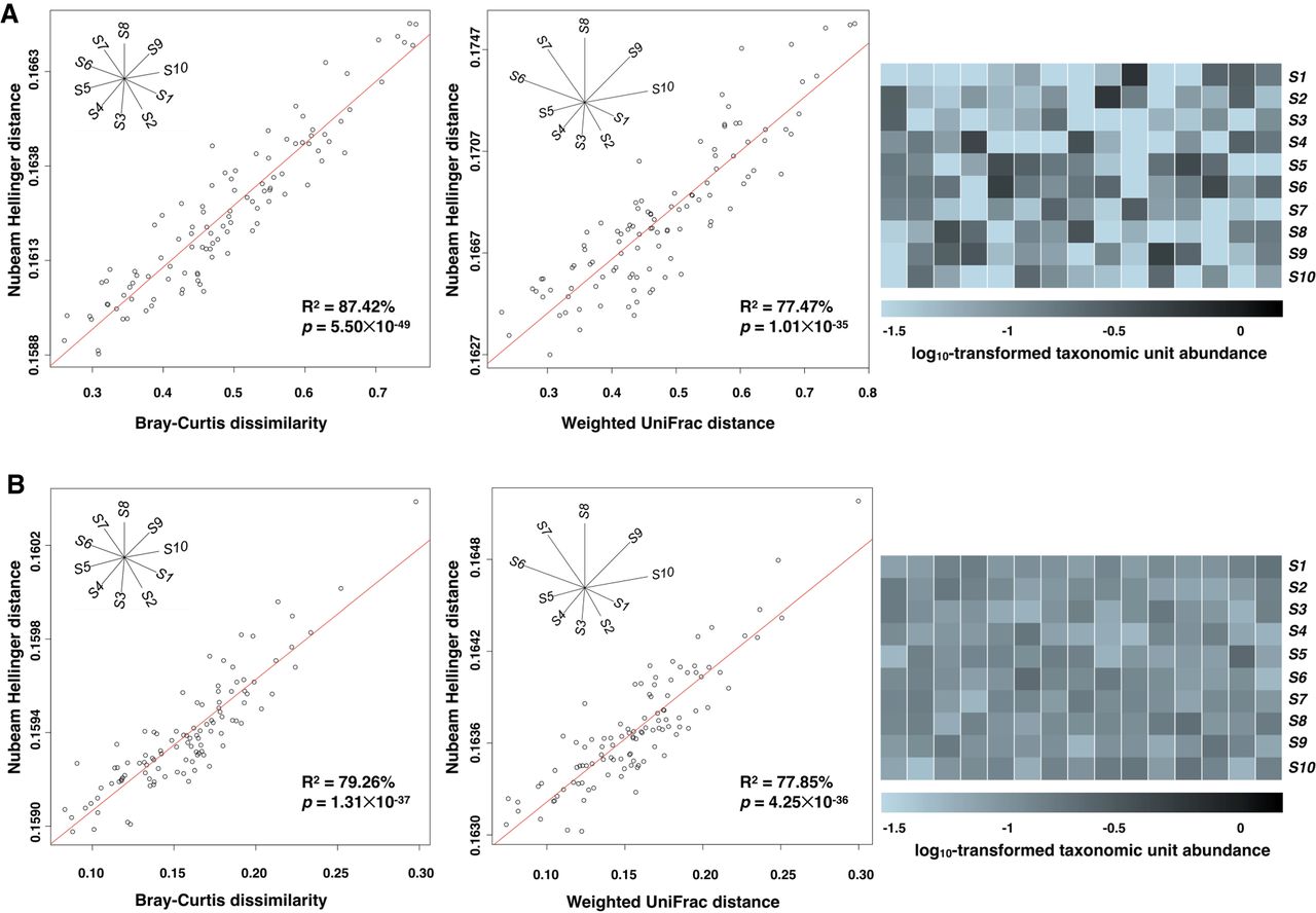 Nubeam Hellinger distances correlate well with composition-based dissimilarities among synthetic communities. We generated four sets of synthetic communities; each set contains 15 samples composed of 10 taxonomic units. The relative abundances of taxonomic units in each sample follow Dir(α1×10), with α being 1 and 10 in A and B, respectively, controlling for the complexity of the community. The relationship among the taxonomic units is shown in the star tree, with branch lengths of either 1 × 10−4 or 2 × 10−4. Each sample has 50 million 75-bp reads. The 105 pair-wise Nubeam distances were calculated among the 15 samples. The significance of linear relationship is measured by R2 and P-value for regression coefficient.