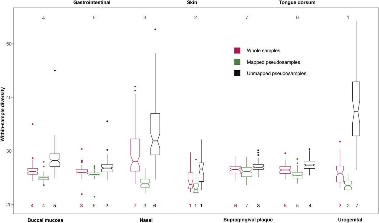 The Nubeam within-sample diversity of the whole sample, mapped, and unmapped pseudosamples for each body habitat. The rankings for the Nubeam within-sample diversity of different body habitats are shown at the bottom; the rankings in the published study (The Human Microbiome Project Consortium 2012) of the same data set using mapping-based methods are shown at the top.