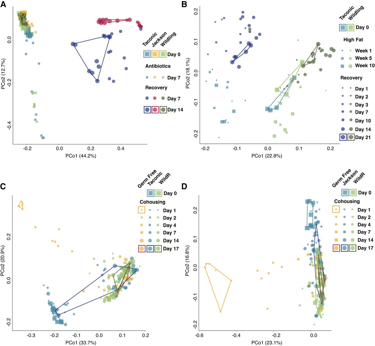 Natural mice microbiota are resilient against interruptions, including (A) antibiotic challenge, (B) high fat dietary challenge, and (C,D) microbial challenge through cohousing, whereas conventional laboratory mice microbiota are generally not. Samples at the beginning and the end of experiments are annotated by convex hulls.