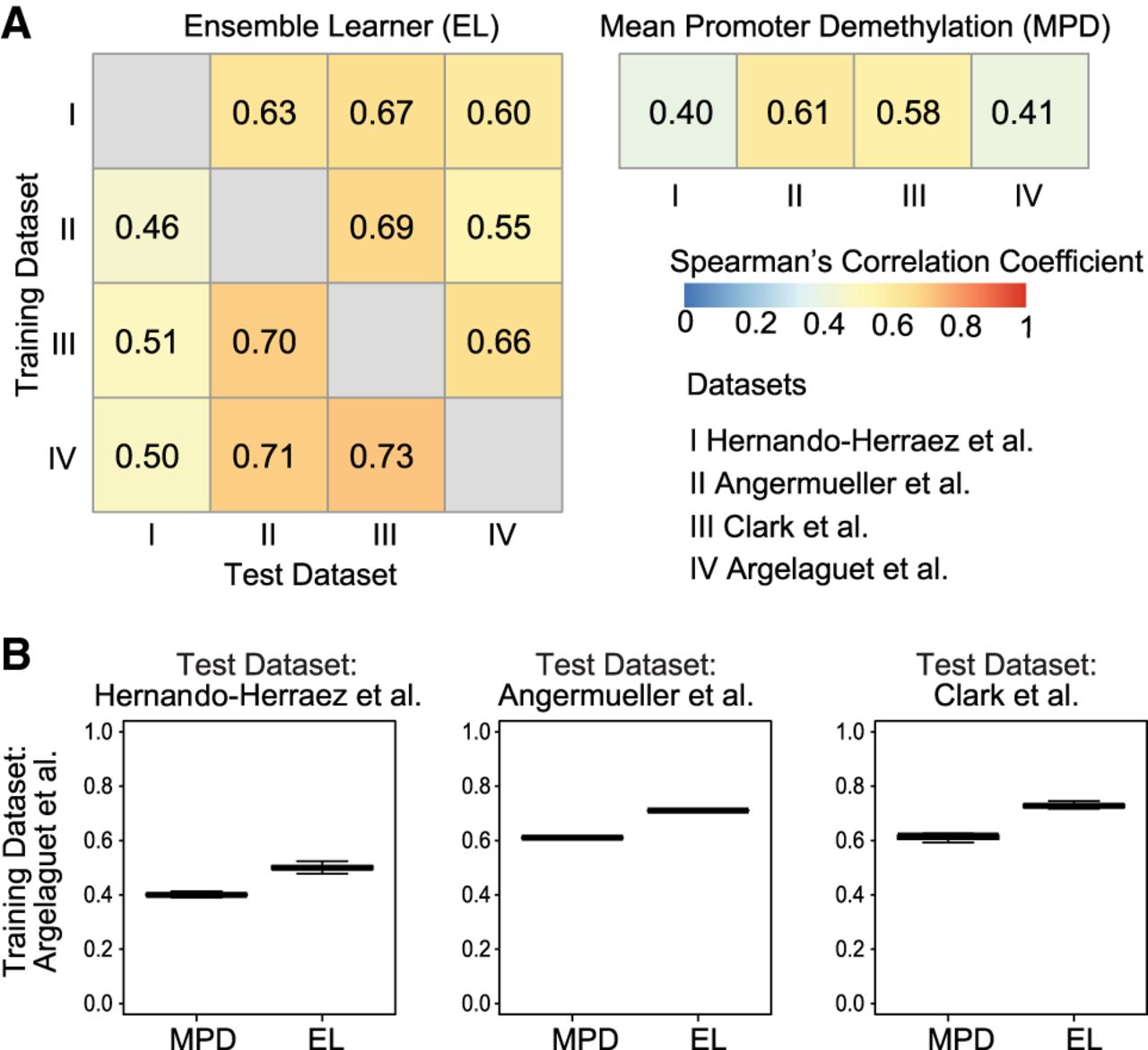 Prediction accuracy of gene expression using DNA methylation data and ensemble learning. (A) Heatmap showing global Spearman's correlation coefficients between observed gene expression and predicted gene activity for all genes across all cells in a data set. Rows represent training data sets, and columns represent test data sets. Row and column Roman numerals correspond to the data sets shown. (B) Distribution of Spearman's correlation coefficients across genes using the data set of Clark et al. (2018) as the training set. Each data point represents one cell. MAPLE (EL) correlations are significantly higher than those of MPD (P < 10−16, one-sided t-test for all three comparisons).