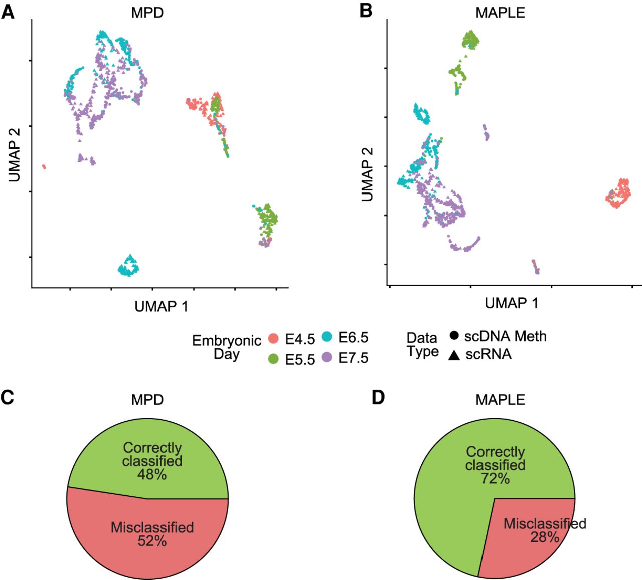 Predictive modeling improves integration with transcriptome data of primary tissues. (A) UMAP plots for integrated expression and DNA methylation data. Mean promoter demethylation (MPD) was used as the input for data integration using Seurat. (B) Same as A, but using MAPLE-predicted gene activity as the input. (C) Pie chart showing the percentage of correctly and misclassified cells using scDNA-methylation data, based on k-nearest neighbor (k-NN) classification on the scRNA-seq cells for the MPD-based UMAP in A. (D) Same as C, but for the MAPLE-based UMAP in B. χ2 test P-value for the comparison between correct and misclassifications in C and D is 3.6 × 10−10.