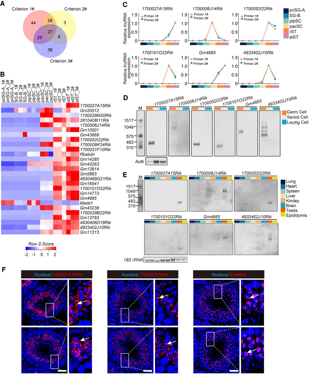 Characterization of potential functional lncRNAs in mouse spermatogenesis. (A) Venn diagram showing the number of lncRNAs meeting the three screening criteria to determine potential functional lncRNAs. (B) Heat map showing relative expression level of the 27 candidate lncRNAs in each germ cell type. 1#, 2#, and 3# refer to three biological replicates per germ cell type. (C) Expression validation of six candidate lncRNAs in each germ cell type by qRT-PCR. Two independent pairs of primers were used for each candidate lncRNA (primer-1# and primer-2#); also see Supplemental Figure S3A. (D) Northern blotting analysis of six candidate lncRNAs in germ cells, Sertoli cells, and Leydig cells. Actb mRNA served as a loading control. (M) RNA molecular weight marker. (E) Northern blotting analysis of six candidate lncRNAs in multiple tissues. 18S rRNA served as a loading control. (M) RNA molecular weight marker. (F) Subcellular localization of candidate lncRNAs (red) from testis sections via RNAscope analysis. Nuclei were stained with DAPI (blue). Representative images with an enlargement of the white framed region are shown on the right. Scale bar, 50 μm.