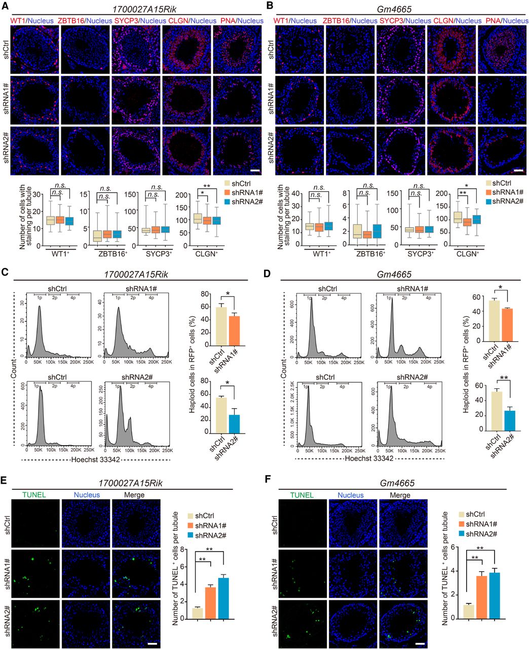 Knockdown of lncRNA candidates leading to defects in late spermatogenesis. (A,B) Immunostaining of testis sections from the control (shCtrl), 1700027A15Rik and Gm4665 knockdown (shRNA1#, shRNA2#) mice for marker proteins (red): WT1, ZBTB16, SYCP3, CLGN, PNA. Nuclei were stained with DAPI (blue). (Top) Representative images; (bottom) number of cells with staining per tubule. Data represent the mean ± SEM of at least 100 seminiferous tubules from three mice. (*) P < 0.05, (**) P < 0.01, (n.s.) P > 0.05 compared with shCtrl, Student's t-test. Scale bar, 50 μm. (C,D) Percentage of RFP+ haploid cells isolated from the control (shCtrl), 1700027A15Rik and Gm4665 knockdown (shRNA1#, shRNA2#) testes by FACS based on fluorescent labeling with Hoechst 33342. (Left) Representative flowcytometry histograms; (right) percentage of haploid cells. Data represent mean ± SEM (n = 4). (*) P < 0.05, (**) P < 0.01 compared with shCtrl, Student's t-test. (E,F) TUNEL assay of testis sections from the control (shCtrl), 1700027A15Rik and Gm4665 knockdown (shRNA1#, shRNA2#) mice. (Left) Representative images; (right) number of apoptotic cells per tubule. Data represent the mean ± SEM of at least 50 seminiferous tubules from three mice. (**) P < 0.01 compared with shCtrl, Student's t-test. Scale bar, 50 μm.