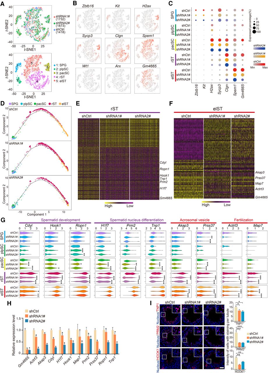 High-resolution dissection of transcriptional alterations induced by Gm4665 knockdown in testis. (A) t-SNE plots of all 5023 RFP+ germ cells. (Top) Cells colored based on differential treatment with shCtrl, shRNA1#, or shRNA2#; (bottom) cells colored by the identified cell populations with the labeled numbers indicating the individual clusters. (B) Expression patterns of marker genes exhibited on t-SNE plots. Cluster 1 was SPG; cluster 2 was plpSC; cluster 3 was pacSC; cluster 4 was rST; and cluster 5 was elST; Wt1 and Arx, somatic cell marker genes, served as negative controls. Red indicates high expression and gray indicates low or no expression. (C) Expression of marker genes and Gm4665 in cell populations from differentially treated shCtrl, shRNA1#, and shRNA2#. (D) Pseudotime analysis of Gm4665 control and knockdown male germ cells during spermatogenesis. (E,F) Heat map showing differentially expressed genes in rST and elST populations upon Gm4665 knockdown according to defined clusters 4 and 5. The color key from yellow to purple indicates high to low gene expression levels. Differentially expressed genes were identified between two groups of cells using a Wilcoxon rank-sum test. (G) Violin plot displaying expression level of representative functional spermatogenic genes upon Gm4665 knockdown in indicated cell populations. P-values were calculated using a Wilcoxon rank-sum test. (*) P < 0.05, (**) P < 0.01, (***) P < 0.001 compared with shCtrl. (H) Expression validation of differentially expressed genes in rST and elST populations by qRT-PCR. Data represent the mean ± SEM for three biological replicates. (*) P < 0.05 compared with shCtrl, Student's t-test. (I) Immunostaining of testis sections from the shCtrl, shRNA1#, and shRNA2# mice for TNP1, PRM2, and HOOK1 (red). Nuclei were stained with DAPI (blue). (Left) Representative images; (right) intensity of cells with staining per tubule. Data represent the mean ± SEM of at least 50 seminiferous tubules from three mice. (*) P < 0.05, (**) P < 0.01, (***) P < 0.001 compared with shCtrl, Student's t-test. Scale bar, 50 μm.