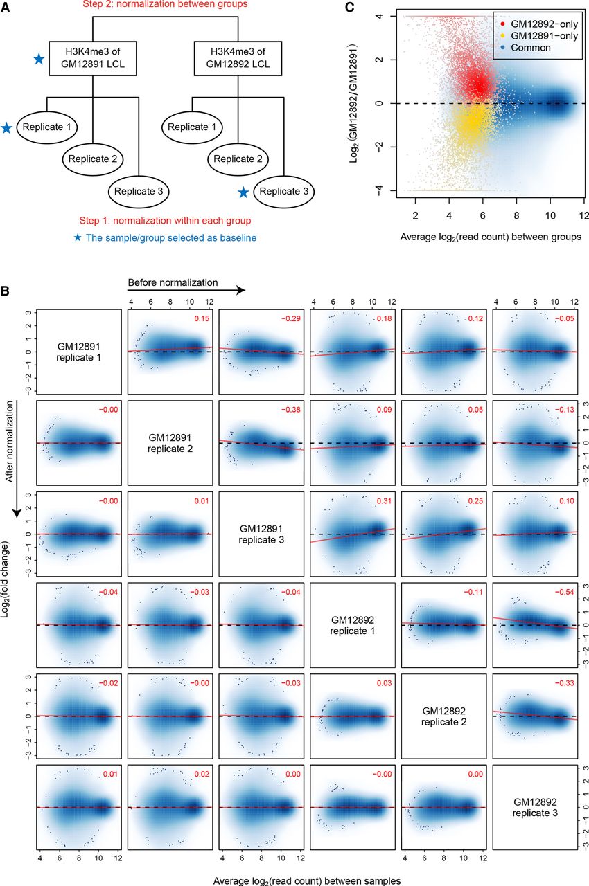 Hierarchical normalization for groups of ChIP-seq samples. (A) Diagram illustrating the hierarchical normalization process applied to the H3K4me3 ChIP-seq samples of GM12891 and GM12892 LCLs. (B) MA scatterplots for each pair of H3K4me3 samples before and after normalization. Only common peak regions of the associated two samples are used to draw each plot, in which the top-right numeric value gives the Pearson correlation coefficient (PCC) between M and A values across these regions. Red lines are fitted by the least squares method. (C) MA scatterplot for normalized reference profiles of GM12891 and GM12892. Here, genomic intervals are classified based on their occupancy states in the two reference profiles.