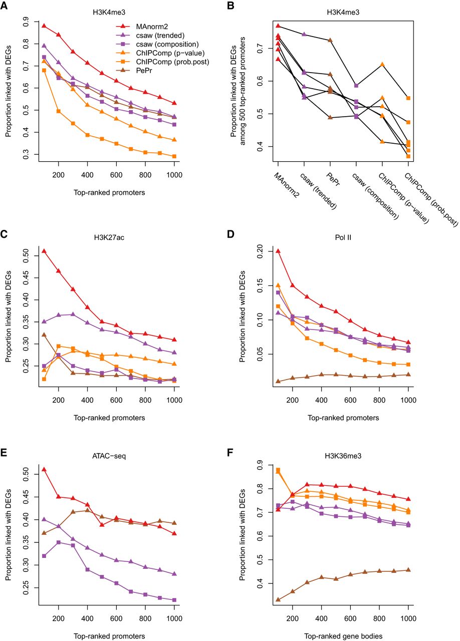 Comparing MAnorm2 with other tools for group-level differential ChIP-seq analysis. (A) Differential analysis of H3K4me3 ChIP-seq data between GM12891 and GM12892. (B) Pairwise comparisons of H3K4me3 levels among GM12890, GM12891, GM12892, and SNYDER. Methods are sorted by the average true discovery proportion (among 500 top-ranked promoter intervals) across all the comparisons. (C) Differential analysis of H3K27ac ChIP-seq data between LCLs and CLL cell lines. (D) Differential analysis of Pol II ChIP-seq data between Japanese and non-Japanese LUAD cell lines. (E) Differential ATAC-seq analysis between LUAD and LUSC patients. ChIPComp is not applicable in this analysis as it requires input samples to model background noise. (F) Differential analysis of H3K36me3 ChIP-seq data between H1 and GM12891.