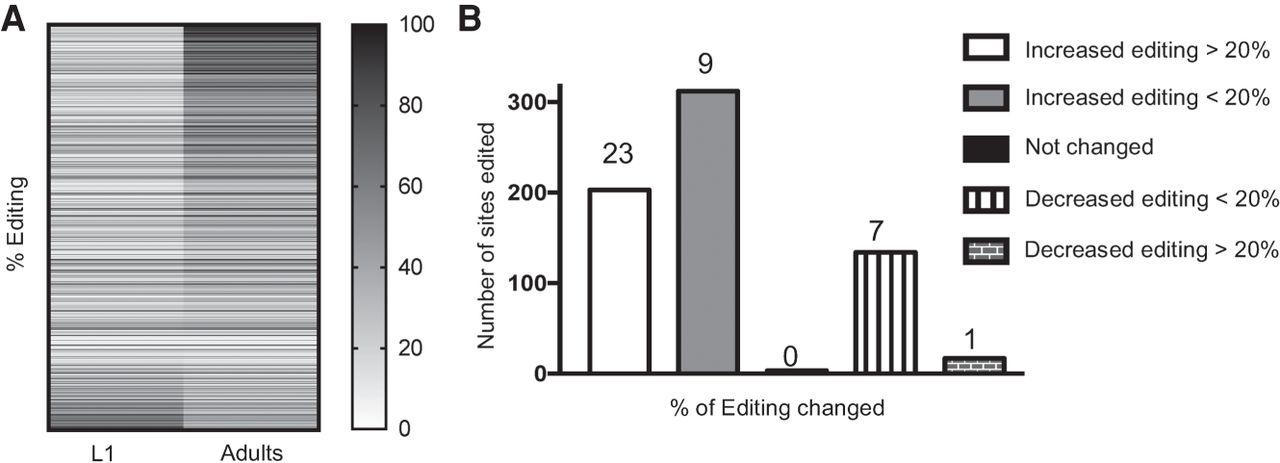 Editing level increases in majority of the sites during neural development. (A) Heatmap representing the percentage of editing in L1 and adult neural cells at the sites (901) with more than five reads in neural RNA-seq from both life stages. (B) The 837 sites mapped to annotated transcripts were categorized into five groups depending on differential editing between L1 and adult neural cells. Bar graph represents the number of editing sites in each group. The number of unique transcripts in each group are listed above each bar.