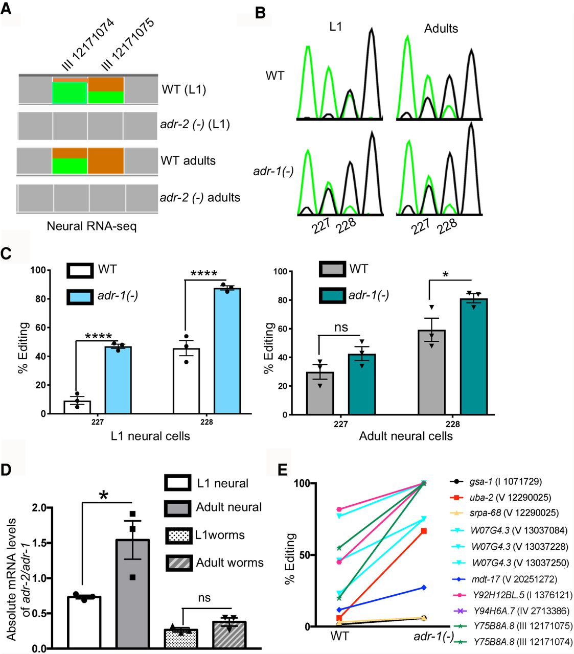 The inhibitory role of adr-1 on editing of neural transcripts is developmentally regulated. (A) Representation of neural RNA-seq reads covering the Y75B8A.8 transcript. Reads from adr-2(-) are negative controls. Green represents adenosine and brown represents guanosine at the marked chromosomal positions. (B) Sanger sequencing chromatograms of cDNA amplified from Y75B8A.8 reporter RNA. Editing sites are listed below the chromatogram. Sites 227 and 228 correspond to chromosomal positions of Chr III: 12,171,074 and 12,171,075. The nucleotides at each position are represented with a different color (green, adenosine; black, guanosine; blue, cytidine; red, thymidine). (C,D) The average of three independent replicates was plotted; error bars, SEM. One-way ANOVA was performed to determine the statistical significance. (****) P < 0.0001; (*) P < 0.05; (ns) P > 0.05. (C) Editing levels of the Y75B8A.8 neural reporter were measured in wild-type and adr-1(-) worms in L1 (left) and adult (right) stages using Sanger sequencing. (D) qPCR was performed to measure the absolute mRNA levels of adr-2 relative to adr-1 in both life stages. (E) Neural RNA-seq data were used to plot the L1 editing levels of representative sites from the group of neural RNAs that showed increased editing in development (P < 0.01, pairwise comparison using two-way ANOVA).