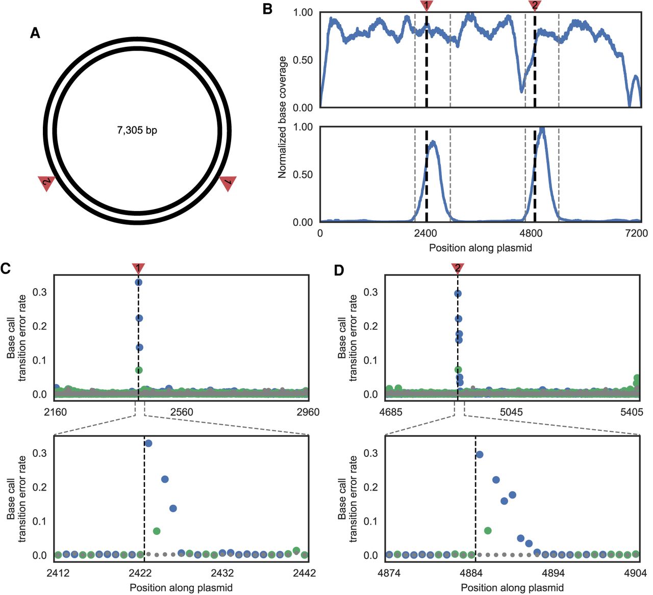 Single-base-pair resolution of nicks in plasmid DNA. (A) Schematic of the plasmid used to test DENT-seq in which red arrows represent the expected locations of nicks after treatment with the nicking endonuclease Nb.BsmI (both are expected on the reference strand). (B) Sequence coverage normalized to the location with maximum read depth for untreated plasmid (top) and plasmid with two nicks introduced by Nb.BsmI treatment (bottom) after performing DENT-seq. Black dashed lines represent the expected locations of nicks after Nb.BsmI treatment and gray dashed lines represent the bounds of MACS2 peaks called on data from the treated sample. (C,D) Mutational signal for all locations within the called MACS2 peaks (top) and close-up views where there is high mutational signal (bottom). Black dashed lines represent the expected locations of nicks after Nb.BsmI treatment. Data in gray represent the untreated plasmid, whereas data in blue and green represent the Nb.BsmI treated sample where a P or K residue would be inserted after a reference strand nick, respectively.