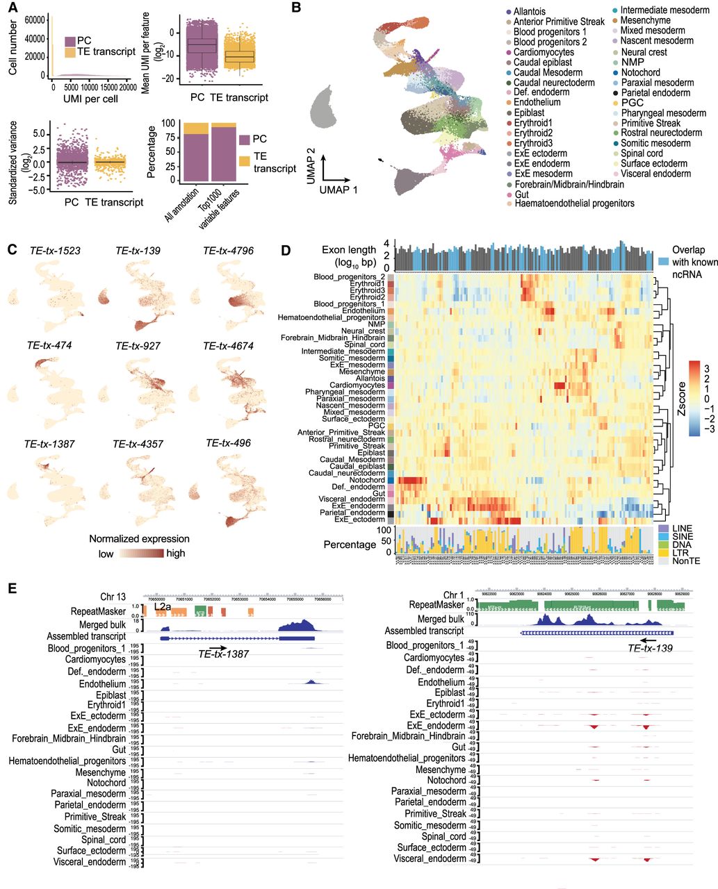 Tissue-specific TE expression during mouse gastrulation and early organogenesis. (A, upper left) Fewer unique molecular identifiers (UMIs) were mapped to TE transcripts than to protein-coding genes. (Upper right) The averaged expression level of TE transcripts across all the cells was lower compared to protein-coding genes. (Lower left) TE transcripts lack the extreme standardized variance observed at protein-coding genes. (Lower right) TE transcripts account for 73 of the top 1000 variable features. (B) UMAP of scRNA-seq data. Cells were colored based on tissue information provided by the original study. (C) Examples of tissue-specific TE transcripts. (D) Normalized expression pattern (center, heatmap) of 146 TE transcripts (columns) across 37 tissues (rows). Transcript length, annotation status (top, bar plot), and TE composition (bottom, bar plot) were shown for each TE transcript. (E) Genome browser view of two TE transcripts with strong tissue enrichment. Assembled TE transcripts, uniquely mapped reads of merged bulk RNA-seq (from 37 samples that were used for transcript assembly), and scRNA-seq signal for selected tissues were shown. (Left) A TE transcript that is initiated from an L2a element, the second exon of this transcript is composed of non-TE sequences. (Right) A TE transcript that is almost exclusively composed of ERV sequences.