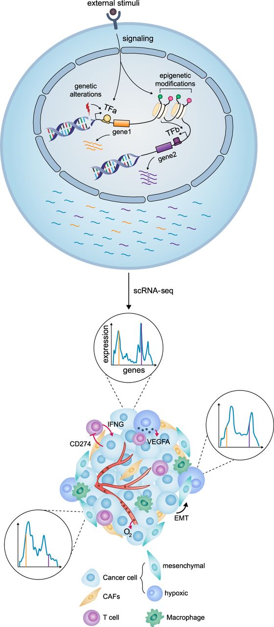 Cell- and system-level view of intratumor heterogeneity. (Top) Intrinsic factors (genetic alterations or epigenetic changes) and extrinsic factors (stimuli from the environment) lead to transcriptional changes, represented here with the expression of two genes (orange and purple). (Bottom) Transcriptional heterogeneity is revealed by scRNA-seq, which gives the gene expression profile of each cell. Histograms depict expression profiles corresponding to different cancer cell states in which two genes (orange and purple lines) are expressed at different levels. Within the tumor, cancer cells may also compete or cooperate with each other and interact with other cells of the tumor microenvironment. Intrinsic epigenetic factors may induce the EMT. Low vascularization and oxygen levels (O2) may induce the hypoxic state, which in turn promotes angiogenesis through VEGFA secretion. Interferon gamma (IFNG) secretion by T cells may lead to an interferon response state with high CD274 (also known as PDL1) expression.
