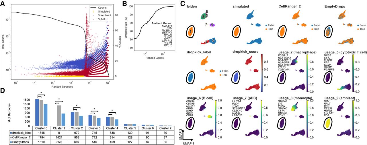 Benchmarking dropkick performance on simulated high-background data. (A) Log-rank total counts curve for the high-background PBMC simulation. The horizontal dashed line indicates the threshold below which ground-truth empty droplets were used to build simulated barcodes from a multinomial distribution (100 total counts). Gold rug plot indicates the location along the total counts curve of 2000 simulated high-UMI droplets (see Methods: High-Background PBMC Simulation). (B) Genes in PBMC simulation ranked by dropout rate. Top 10 ambient genes are listed, defining ambient profile used to calculate percentage in A. (C) UMAP embedding of all barcodes kept by dropkick_label, CellRanger_2, and EmptyDrops. Points colored by each of the three filtering labels, Leiden clusters determined by NMF analysis, dropkick score (cell probability), and select cell type metagene usages from NMF. Top seven gene loadings for each NMF factor are printed on their respective plots, in axis order from top to bottom. Circled area shows independent cluster of simulated empty droplets. (D) Table and bar graph enumerating the total number of barcodes detected by each algorithm in all NMF clusters. Significant cluster enrichment as determined by sc-UniFrac is denoted by brackets.