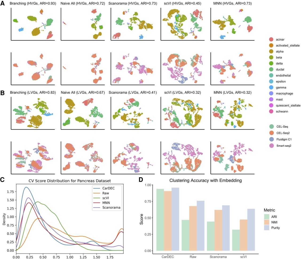 Justification for the branching architecture in CarDEC. The CarDEC API splits the input matrix into HVGs and LVGs and treats them separately with a “Branching” architecture as in Figure 1. Alternatively, we can use a “Naive” model that treats all features the same regardless of gene expression variance. The naive model consists of an autoencoder with a clustering loss in addition to the reconstruction loss. Here, we show the utility of the branching architecture. The HVGs and LVGs were clustered separately, and the ARI of assignments is provided along with a UMAP plot. The top row was colored by cell type, the bottom row by scRNA-seq protocol. (A) UMAP embedding computed from the denoised HVG counts for each method: CarDEC with Branching architecture, CarDEC with Naive Architecture, Scanorama, scVI, and MNN. (B) UMAP embedding computed from the denoised LVG counts for each method. Figure legends are the same as those in A. (C) Density plot of genewise coefficient of variation (CV) among batch centroids. Density plots are provided for HVGs and LVGs separately. (D) Clustering accuracy metrics were obtained using the embedding-based methods to cluster the data, rather than running Louvain on the full gene expression space. Results for “Raw” were obtained by using Louvain's algorithm on the original HVG counts and are provided as a baseline to which embedding-based clustering results may be compared.