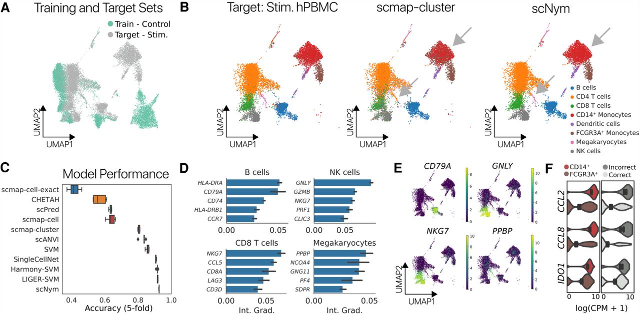 scNym transfers annotations from unstimulated immune cells to stimulated immune cells. (A) UMAP projection of unstimulated PBMC training data and stimulated PBMC target data with stimulation condition labels. (B) UMAP projections of ground truth cell type labels (left), scmap-cluster predictions (center), and scNym predictions for both CD14+ and FCGR3A+ monocytes. scmap-cluster confuses these populations (arrow). (C) Classification accuracy for scNym and baseline cell identity classification methods. scNym is significantly more accurate than other approaches (P < 0.01, Wilcoxon rank sums). (D) Integrated gradient analysis reveals genes that drive correct classification decisions. We recover known marker genes of many cell types (e.g., CD79A for B cells, PPBP for megakaryocytes). (E) Cell type specificity of the top salient genes in a UMAP projection of gene expression (log normalized counts per million). (F) Integrated gradient analysis reveals genes that drive incorrect classification of some FCGR3A+ monocytes as CD14+ monocytes. Several of the top 15 salient genes for misclassification are CD14+ markers that are up-regulated in incorrectly classified FCGR3A+ cells.