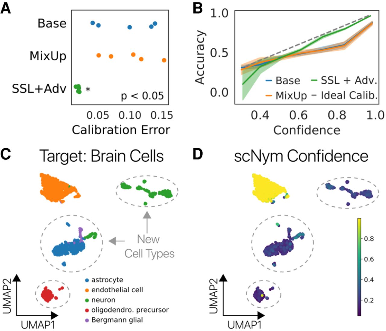 scNym confidence scores highlight unseen cell types. (A) scNym calibration error for models trained on the human PBMC cross-stimulation task. Semisupervised and adversarial training significantly reduced calibration error relative to models trained with only supervised methods (Base, MixUp). (B) Calibration curves capturing the relationship between model confidence and empirical accuracy for models in A. (C) scNym models were trained to transfer annotations from a mouse atlas without brain cell types to data from mouse brain tissue. We desire a model that provides low-confidence scores to the new cell types and high-confidence scores for endothelial cells seen in other tissues. (D) scNym confidence scores for target brain cells. New cell types receive low-confidence scores as desired (dashed outlines).