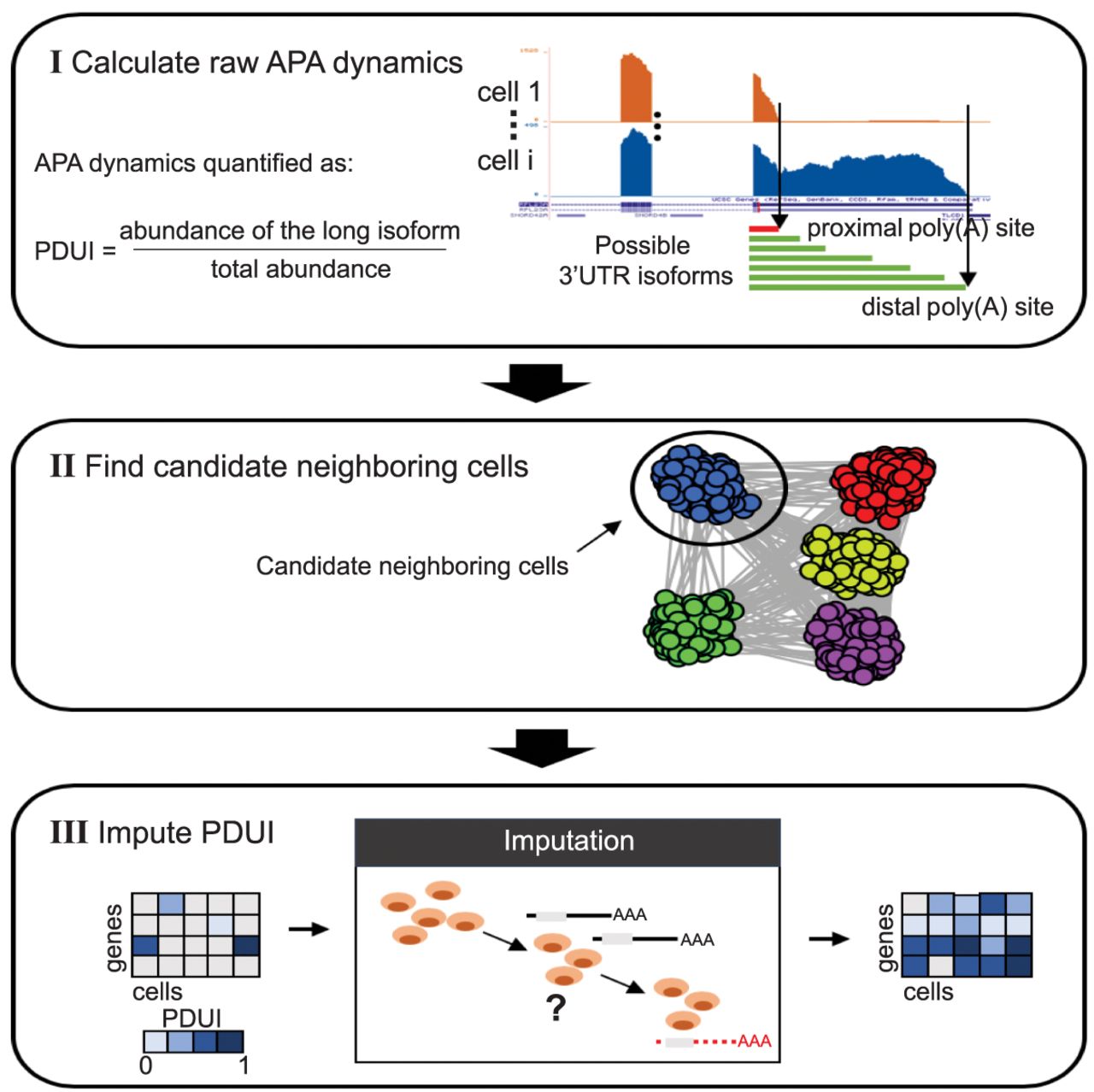 A schematic illustration of the scDaPars algorithm. (I) scDaPars predicts both distal and proximal poly(A) sites by joint analysis of all single-cell samples and quantifies the raw relative APA usage by the proportion of estimated abundances of transcripts with distal poly(A) sites (long isoform). (II) scDaPars determines potential neighboring cells by applying community detection methods in APA profiles generated in step I. (III) scDaPars uses the NNLS regression model to refine neighboring cells and impute missing values by borrowing APA information from neighboring cells.