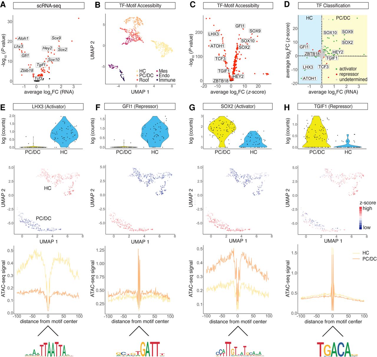 Transcriptional activator and repressor classification. (A) Volcano plot of differentially expressed TF genes between the HC and PC/DC clusters (P-adjusted < 0.05). (B) UMAP of TF motif accessibility z-scores calculated from chromVAR. Cells are color-coded based on SnapATAC clusters. (C) Volcano plot of differential TF motif accessibilities calculated from z-scores between the HC and PC/DC clusters (P-adjusted < 0.05). (D) Dot plot of TF classification shown in average log2 fold change (FC) mRNA level and z-scores. The differential expression from scRNA-seq between HCs and PC/DCs is plotted on the x-axis, and the differential accessibility from scATAC-seq is shown on the y-axis. Activators are classified in green, repressors in red, and undetermined TFs in gray. (E–H) TF activities in differentiating HCs and PC/DCs in terms of mRNA expression, chromatin accessibility, and footprints. (E) LHX3, a transcriptional activator in HCs. (First row) Violin plot of RNA expression. Each dot represents a single cell. (Second row) UMAP plot of LHX3 motif accessibility calculated as z-score. Red indicates higher accessibility compared with blue. Each dot represents a single cell. (Third row) LHX3 footprint calculated from scATAC-seq data using HINT-ATAC. Activators are characterized by high scATAC-seq signal in the flanking region of the TF binding sites compared with the control population. Yellow line represents the HC cluster, and orange line represents the PC/DC cluster. (Fourth row) Mouse HOCOMOCO v10 consensus sequence for the LHX3 motif. (F–H) Analogous data representation for (F) GFI1, classified as a HC repressor; (G) SOX2, a PC/DC activator; and (H) TGIF1, a repressor in PC/DCs.