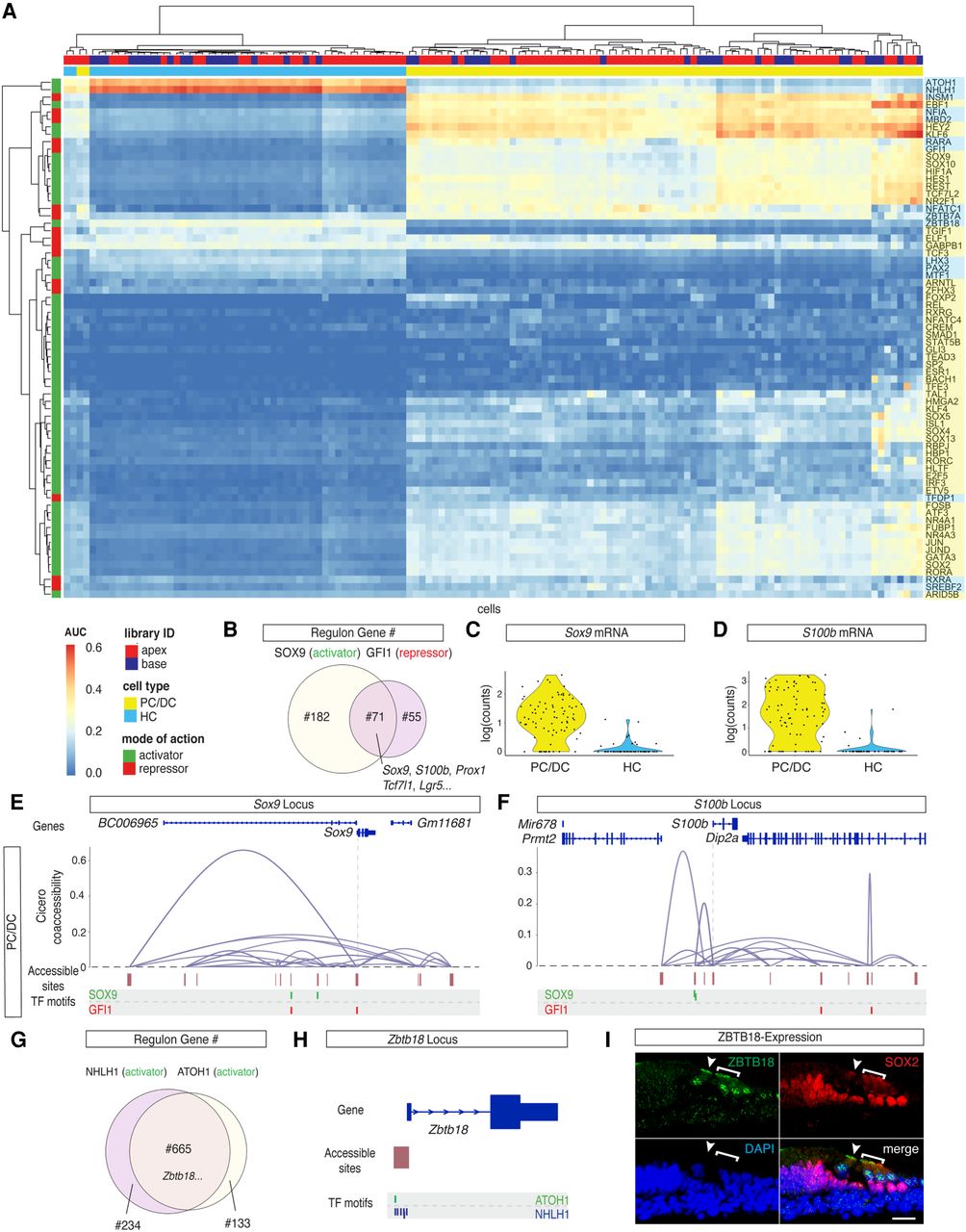 TFs controlling HC and PC/DC differentiation. (A) AUC enrichment matrix with hierarchical clustering at single-cell resolution revealed the regulon activities during differentiation of HCs and PC/DCs. A regulon summarizes putative downstream target genes as a group of the respective TF. The activity of the regulon is color-coded from blue (depletion) to red (enrichment). Hierarchical clustering reveals similarities between individual cells (x-axis) and between different regulons (y-axis). Color bars on the top and to the side of the heat map indicate library ID, cell type, mode of action, and cell type specificity. (B) Venn diagram of the number of overlapped downstream target genes between the SOX9 regulon and GFI1 regulon. (C,D) Violin plots of Sox9 (C) and S100b (D) expression level. The two genes are representatives of overlapping downstream target genes between the SOX9 and GFI1 regulons. (E,F) Coaccessibility analysis of Sox9 and S100b loci in the PC/DC cluster using Cicero. (E) In PC/DCs, Sox9 TSS is directly and indirectly connected to the accessible sites. They correspond to predicted regulatory elements that contain putative TF binding sites for SOX9 and GFI1, as determined by FIMO motif scanning. (First row) Genome annotation from UCSC Known Genes. (Second row) Coaccessibility plot connects predicted regulatory elements with the TSS. (Third row) Accessible regions aligned with the locus. (Forth row) Putative TF binding sites of SOX9 and GFI1 motifs relative to the accessible regions. TSS position is indicated with a dashed line. (F) Analogous data representation for the S100b locus. (G) Overlapping downstream target genes between known HC transcriptional activators ATOH1 and NHLH1. (H) Zbtb18 is a shared target gene between the ATOH1 and NHLH1 regulons with accessible TF binding sites for both TFs at the TSS in HCs. (I) Immunostaining of ZBTB18 protein expression in IHCs and OHCs in cryosections of the organ of Corti (P2). Arrowhead pointing at the IHC. Bracket delineates OHC location. Scale bar, 20 µm.