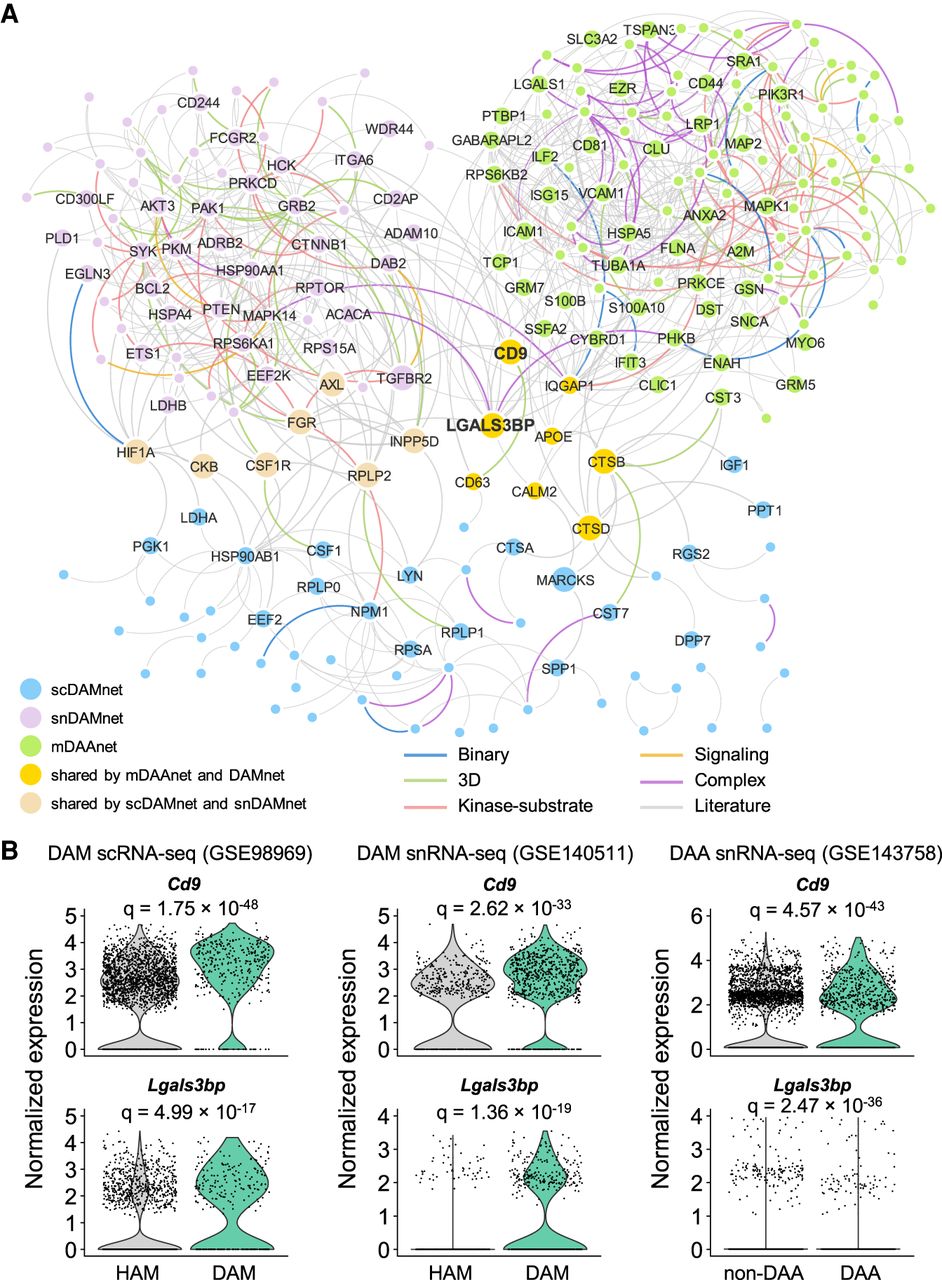 Comparison of molecular networks between DAA and microglia (DAM). (A) Visualization of interplays between DAM and DAA molecular networks in the human protein–protein interactome network model. (B) Expression levels of Lgals3bp and Cd9 for homeostatic associated microglia (HAM) versus DAM and non-DAA versus DAA. The adjusted P-value (q) is computed using the MAST R package (Supplemental Material). All details for gene differential expression analyses are provided in Supplemental Tables S4, S5, and S7.