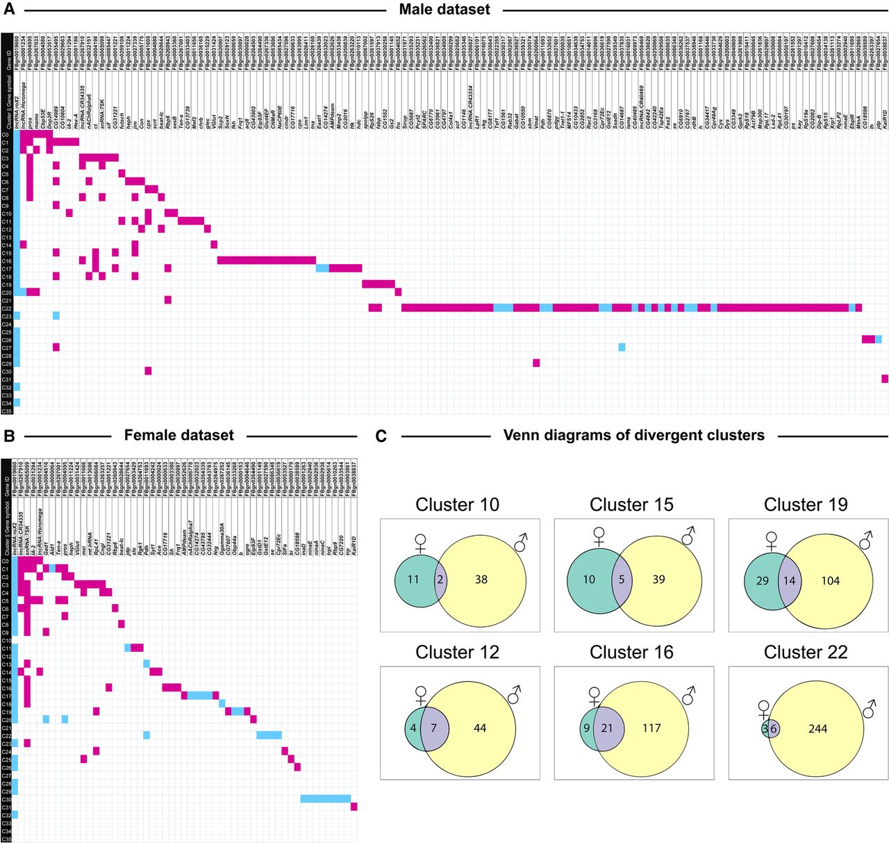 Distribution of differentially expressed genes across clusters in males (A) and females (B) exposed to cocaine, and Venn diagrams showing overlap between differentially expressed genes in males and females (C). To identify clusters with unique gene expression patterns following acute exposure to cocaine, we filtered the list of differentially expressed genes to only show the strongest responses (|logeFC| > 1.0, Bonferroni-adjusted P-value < 0.05) to construct an expression matrix. Differentially expressed genes are listed on the top (columns) and cell clusters are represented by the rows. Magenta boxes show up-regulation and turquoise boxes show down-regulation of gene expression as a result of exposure to cocaine. Panel C shows Venn diagrams of clusters with sexually dimorphic responses to cocaine exposure. The numbers within each Venn diagram represent the unique and shared differentially expressed (|logeFC| > 0.5, Bonferroni-adjusted P-value < 0.05) genes due to cocaine exposure from DGE analysis performed for the corresponding cluster in male and female data sets separately.