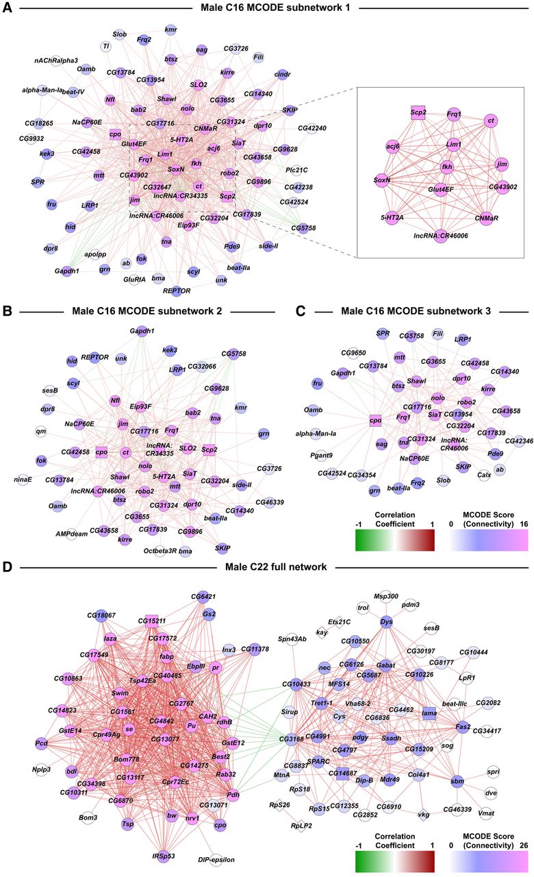 Subnetworks from coexpression network analyses of DEGs from the male C16 and C22 clusters. Networks are constructed from Pearson coefficient-based coexpression values calculated from scaled data of genes that were differentially expressed (filtered for |logeFC| > 0.5, Bonferroni-adjusted P-value < 0.05) due to cocaine exposure. Coexpressions have been filtered using Random Matrix Theory. (A–C) MCODE subnetworks derived from the full network of male cluster C16. The inset in A corresponds to a subset of genes within the subnetwork that have very strong correlation coefficient values with each other compared to the rest of the data set. Colors of the dots represent the connectivity index derived from MCODE scores. Colors of edges represent the positive (red) and negative (green) correlations. (D) Coexpression network analysis of DEGs from the male C22 cluster.