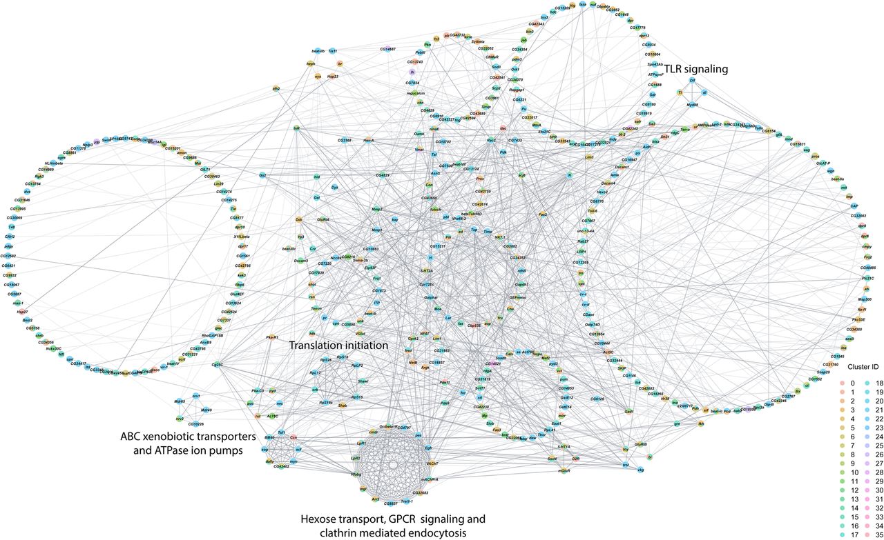 Interaction network analysis of DEGs from all clusters in the male data set. Network constructed from interactions calculated using StringApp plugin within Cytoscape for genes that were differentially expressed (filtered for |logeFC| > 0.1 and Bonferroni-adjusted P-value < 0.05) in all clusters from the male data set. Gray edges represent interactions. Genes that were differentially expressed in multiple clusters are depicted as pie charts with each color representing the respective cluster. Genes are grouped into circles based on their MCODE connectivity scores. Annotations of these circular groups represent the pathways that are enriched for the genes within these groups. Bonferroni-adjusted P-value < 0.05 was considered as significant for enrichment in the statistical overrepresentation tests.