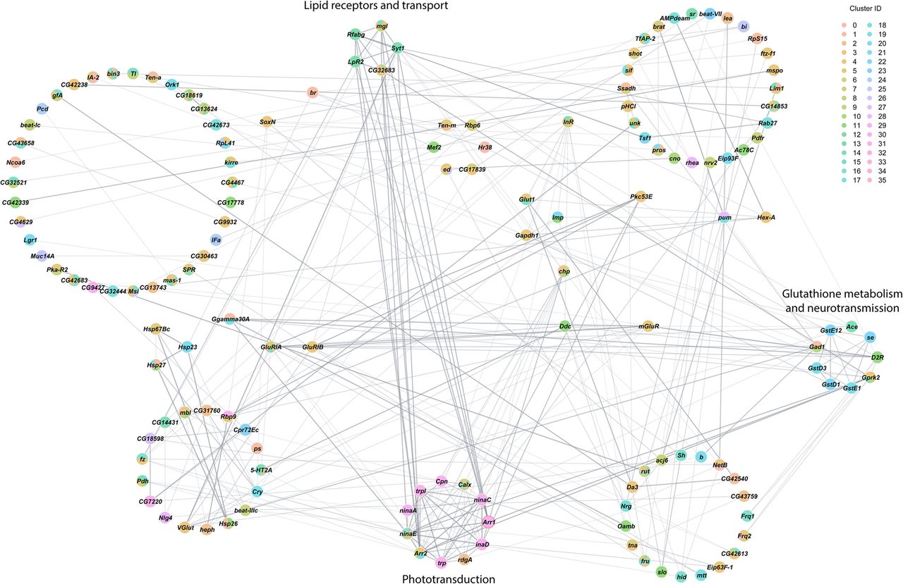 Interaction network analysis of DEGs from all clusters in the female data set. Network constructed from interactions calculated using StringApp plugin within Cytoscape for genes that were differentially expressed (filtered for |logeFC| > 0.1 and Bonferroni-adjusted P-value < 0.05) in all clusters from the female data set. Gray edges represent interactions. Genes that were differentially expressed in multiple clusters are depicted as pie charts with each color representing the respective cluster. Genes are grouped into circles based on their MCODE connectivity scores. Annotations of these circular groups represent the pathways that are enriched for the genes within these groups. BH-FDR adjusted P-value < 0.05 was considered as significant for enrichment in the statistical overrepresentation tests.