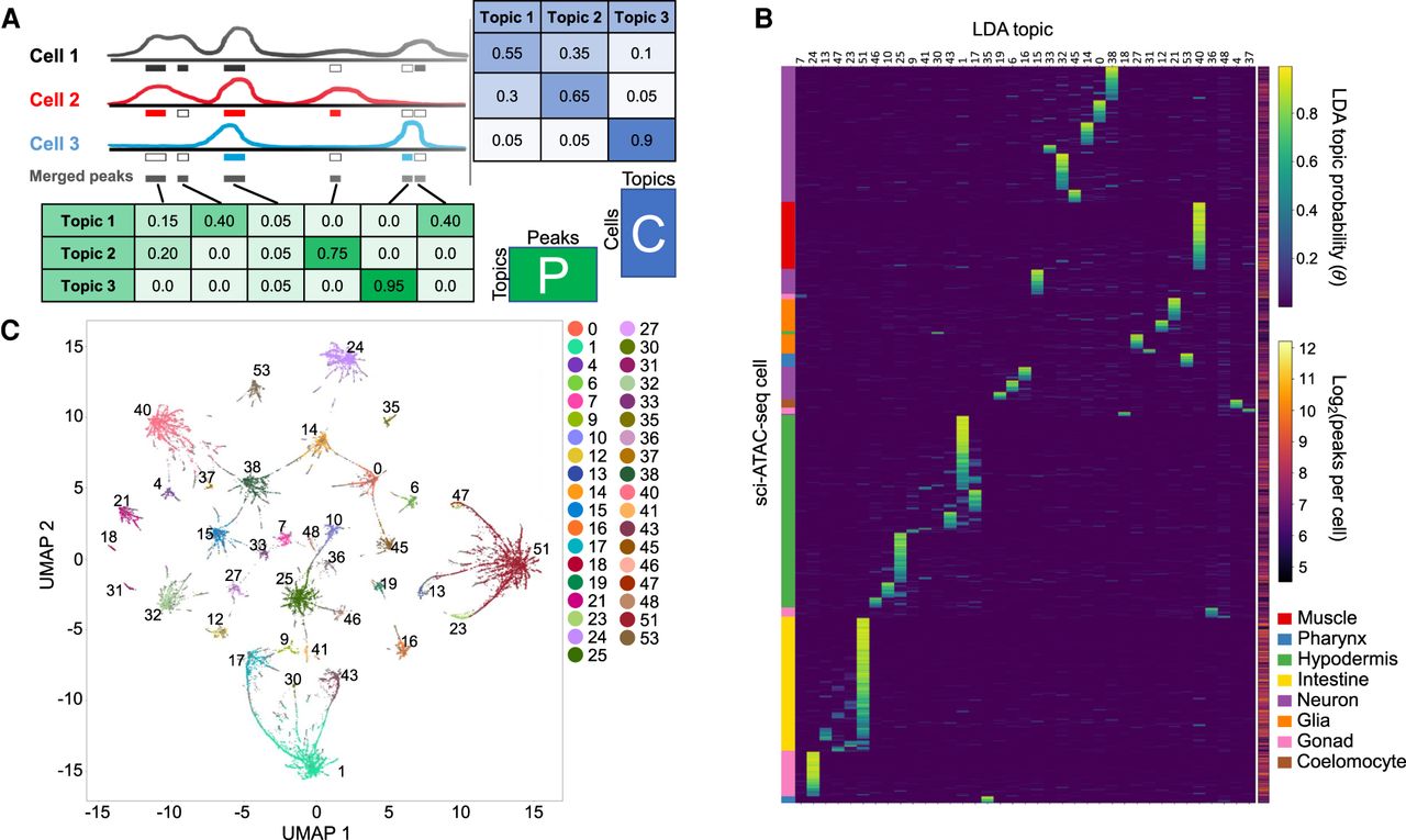 LDA modeling yields 37 major cell clusters that are characterized mostly by a single topic each. (A) LDA modeling learns latent topics that explain the data and return two matrices, here designated P and C. Matrix P, referred to in the text as the peaks-by-topics matrix, captures the probability distribution of each topic over all peaks, whereas matrix C, referred to in the text as the cells-by-topics matrix, captures the probability distribution of each cell over all topics. (B) Heatmap showing the normalized C matrix values for the 37 topics associated with clusters; this plot highlights that most cells have probability concentrated in one or a few topics. Cell types determined for the topics based on analysis of the P matrix are annotated on the left, and the number of peaks per cell is shown to the right. (C) UMAP embedding of the C matrix colored to indicate the 37 cell clusters. Any cells that are not assigned to a cluster are plotted as small gray dots and are mostly found on the periphery of the clusters.