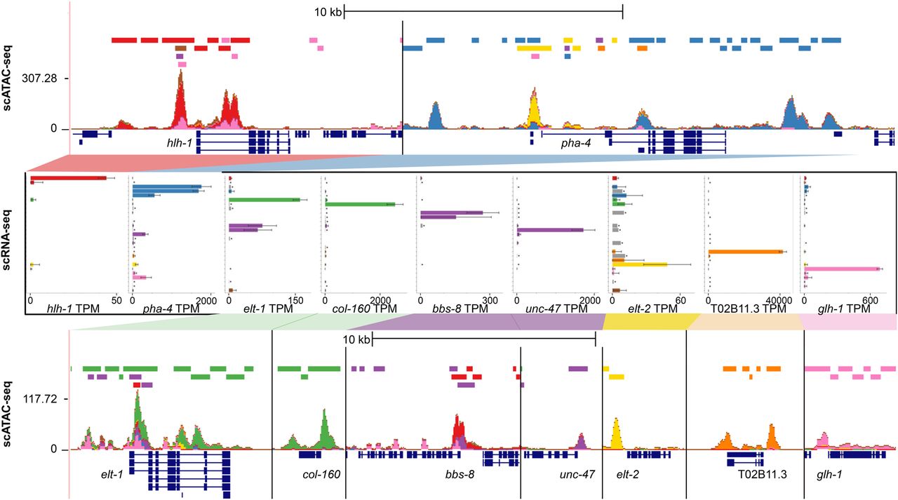 Known tissue-specific genes show topic-specific chromatin accessibility. UCSC Genome Browser multilocus view of the regions surrounding nine known tissue-specific genes (top and bottom), as well as the tissue expression patterns from sci-RNA-seq (middle). In each genome browser view, the top track shows the locations of sci-ATAC-seq peaks colored by tissue type, the second track shows the stacked sci-ATAC-seq signal from each tissue, the third track shows consensus peak regions around local maxima in the signal track, and the fourth track shows the gene models. The gene expression bar plots show expression values for 27 tissues in TPM units, with the same coloring and order as the legend in Figure 5.