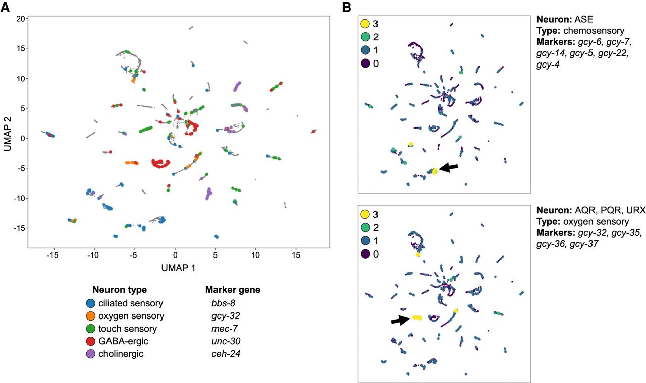 Subclustering of neurons reveals finer structure that distinguishes different types of neurons. (A) Cells with reads in peaks near genes with expression patterns specific to neuron subtypes cluster together (bbs-8: ciliated sensory neurons; gcy-32: oxygen sensory neurons; unc-30: GABA-ergic neurons; mec-7: touch receptor neurons; ceh-24: cholinergic neurons). (B) Cells in the UMAP plot are colored by the number of marker genes with nearby coaccessible peaks. Here, we show marker genes for the ASE neurons, a specific pair of ciliated sensory neurons, which are identified in one of the bbs-8 clusters from A (marked by the left-facing arrow), and show marker genes shared by the oxygen sensory neurons AQR, PQR, and URX, which further support the cluster marked with gcy-32 in A (marked by the right-facing arrow).