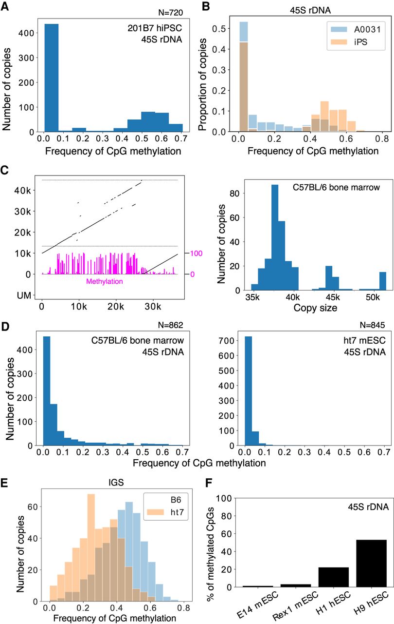 rDNA methylation in pluripotent stem cells. (A) The 45S rDNA methylation status of rDNA in hiPSCs does not differ from that in other differentiated samples: ∼40% of the transcribed region is methylated. (B) Comparison of the 45S rDNA methylation status in Werner syndrome patient fibroblasts (A0031) and iPSCs derived from them. The y-axis is the proportion of reads in each bin. The frequency of methylated copies is increased in iPSCs. (C) Representative rDNA from a Cas9-enriched Nanopore read of a mouse sample (left). Magenta bars represent CpG methylation. The estimated size distribution of mouse rDNA copies in C57BL/6 bone marrow cells is shown on the right. The rDNA copy size of mouse is much smaller than previously reported. (D) 45S rDNA methylation levels in B6 bone marrow cells and ht7 mESCs. Methylation levels among copies are more continuous in mice, and almost no methylation is seen in mESCs. (E) Comparison of IGS methylation levels in B6 bone marrow cells and ht7 mESCs. ht7 clearly shows a lower methylation level, even in the IGS region. (F) Proportion of CpGs methylated in the 45S rDNA of mESCs and hESCs determined by using publicly available short-read bisulfite whole-genome sequencing data. Although both samples of mESCs show a very low level of methylation, a substantial proportion of CpGs are methylated in hESCs.