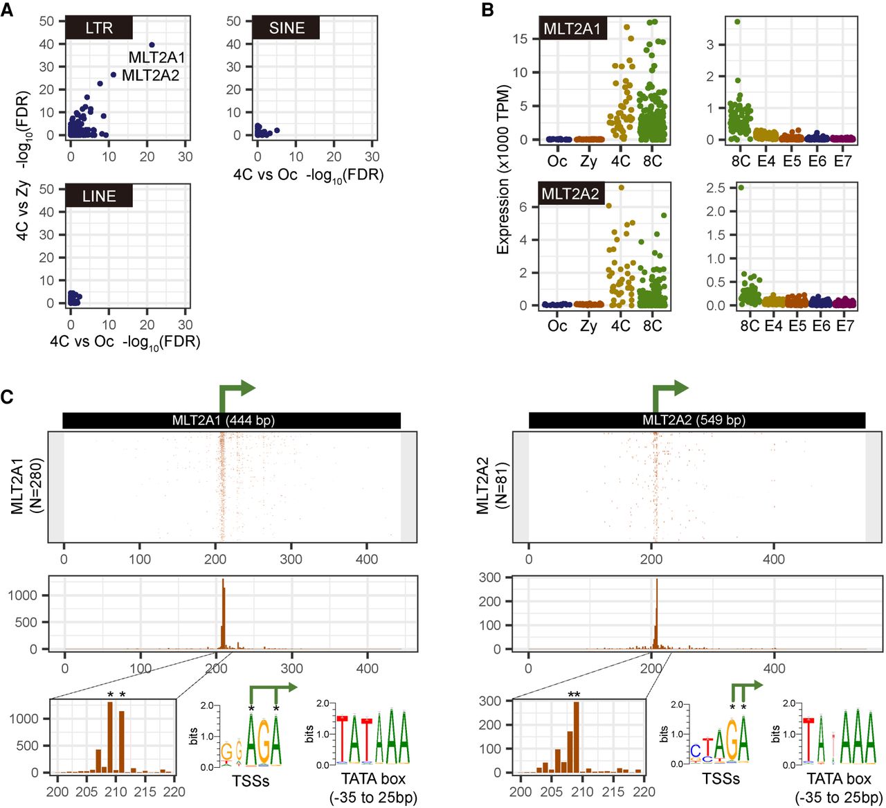 Activation of MLT2A1 and MLT2A2 copies in four-cell stage human embryos. (A) Scatter plots of −log10(FDR) values for differential expression between four-cell embryo and oocyte (x-axis) and between four-cell embryo and zygote (y-axis) by using single-map reads; the plots, including multimap reads, are shown in Supplemental Figure S1B. Each dot represents a family of LTR, LINE, or SINE. (B) Normalized expression values (tags per million mapped tags [TPM]) of MLT2A1 and MLT2A2 in each single-cell: (Oc) oocyte; (Zy) zygote; (4C) four-cell embryo; (8C) eight-cell embryo; (E4 to E7) embryo on day 4 to day 7. STRT data from oocyte to eight-cell embryos are shown in the left panels, and RNA-seq data from eight-cell embryo to embryo on day 7 are shown in the right panels. (C) Location of transcription start sites (TSSs) on the active MLT2A1 and MLT2A2 elements. The middle panel shows the frequency of TSSs at each position. Asterisks indicate two most frequent positions.
