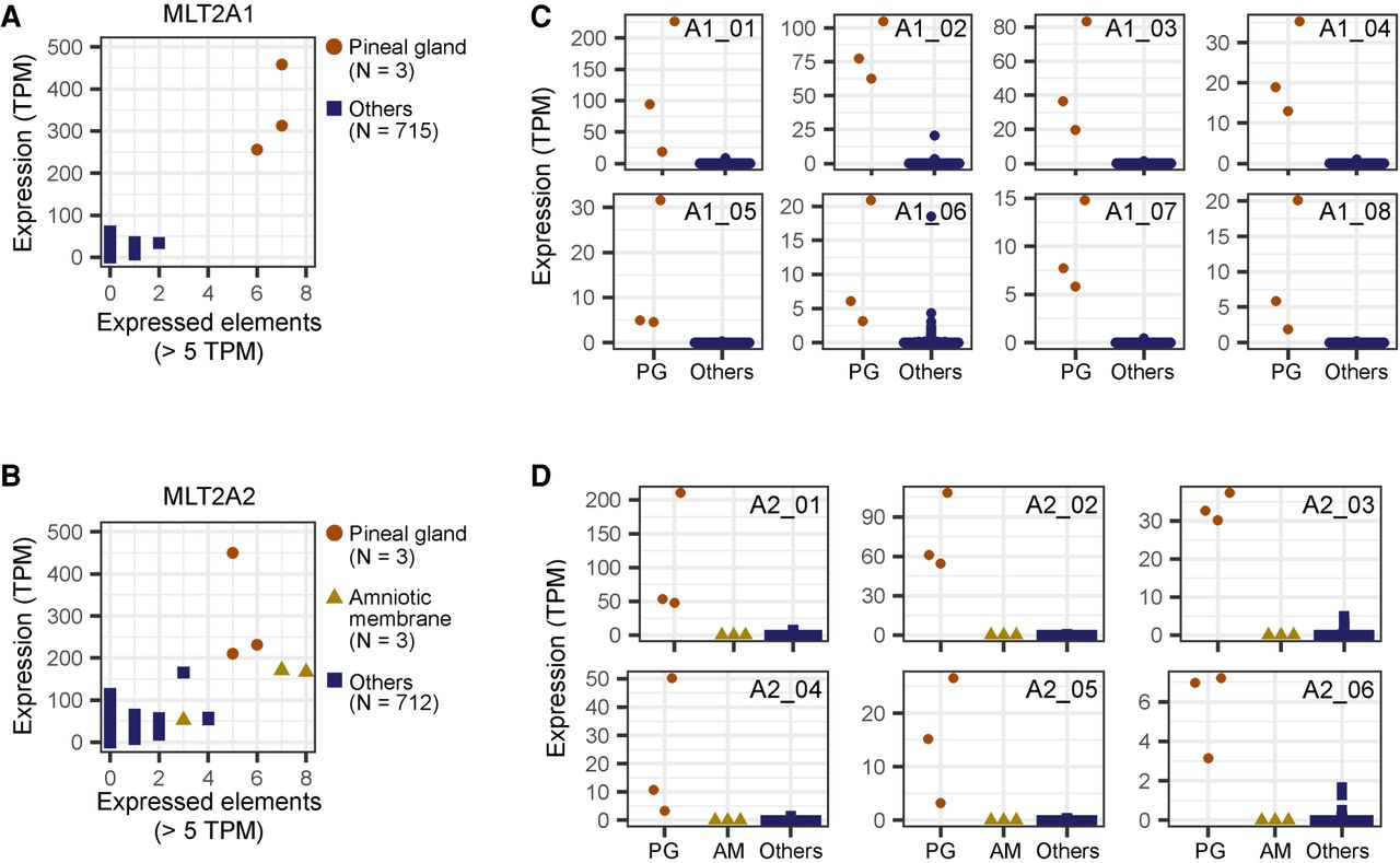 Specific expression of MLT2A elements in pineal gland. (A,B) Scatter plots of 718 human samples including three pineal glands denoted by brown circles. The x-axis indicates the numbers of expressed elements, and the y-axis indicates normalized expression values, measured by CAGE (tags per million mapped tags [TPM]). (C) Normalized expression values of individual MLT2A1 elements that are actively transcribed in pineal gland. Expression values are shown separately for three pineal glands (PG) and 715 other samples. (D) Normalized expression values of individual MLT2A2 elements.