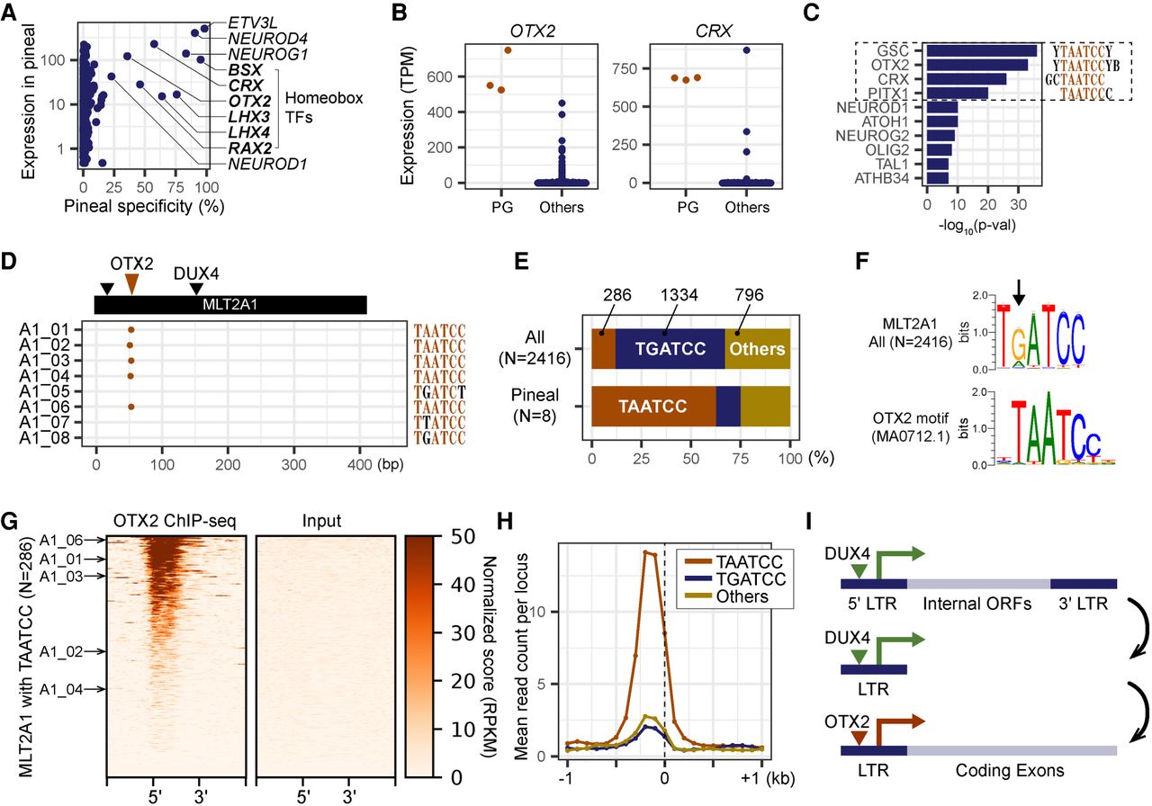 OTX2 as a potential regulator of MLT2A elements in pineal gland. (A) Scatter plot of the levels of pineal gland expression of 1665 human transcription factors. The x-axis indicates the specificity of pineal gland expression (pineal gland expression as a percentage of the total expression of all samples). Gene names of the top 10 transcription factors (displaying the highest pineal specificity) are listed. (B) Normalized expression values of OTX2 and CRX genes in three pineal glands (PG) and 715 other samples. (C) The top 10 transcription factors significantly enriched in promoter regions of pineal-specific genes identified by using HOMER. (D) Distribution of OTX2 binding motifs (MA0712.1) in eight MLT2A1 elements; the motifs were identified by using MAST software. (E) The percentages of MLT2A elements that have TAATCC, TGATCC, or other hexamer sequences. (F) Sequence logos of OTX2 motif-enriched regions in MLT2A1 and the original OTX2 motif. (G) OTX2 binding states in 286 MLT2A elements that have the TAATCC sequence and flanking regions (±1 kb) for ChIP-seq and input samples. The pineal-active five MLT2A elements are denoted by arrows. (H) Normalized ChIP-seq read counts on MLT2A1 elements that have TAATCC (N = 286), TGATCC (N = 1334), or other (N = 796) sequences. (I) Schematic representation of the transition of LTR retrotransposons from full-length to the solo-LTR fused to a protein-coding gene.