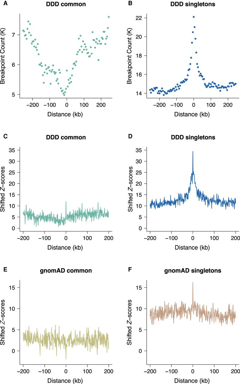 Locally elevated structural variation rates at spermatogonial regulatory sites. SV breakpoint count (A,B) and circular permutation shifted Z-scores (C,D) of deletion breakpoints in the DDD cohort, centered around the midpoints of spermatogonial ATAC-seq peaks. “Singletons” are breakpoints of deletions with a frequency of ∼ 0.002% across population samples; “common” variants are seen at a frequency of at least 1% in the DDD consensus data set (see main text); permutation P-values indicate significant enrichment for both types of variants at ATAC-seq peaks (P < 10−5 in each case). (E,F) Circular permutation shifted Z-scores of gnomAD deletion breakpoints, centered around spermatogonial ATAC-seq peaks. “Singletons” are breakpoints of deletions with a frequency of ∼0.002% across population samples; “common” variants are seen at a frequency of at least 5% in the gnomAD V.2 data set. Permutation P-values indicate significant enrichment for singleton breakpoints (P < 10−5) and a significant depletion for common variants (P < 0.01).