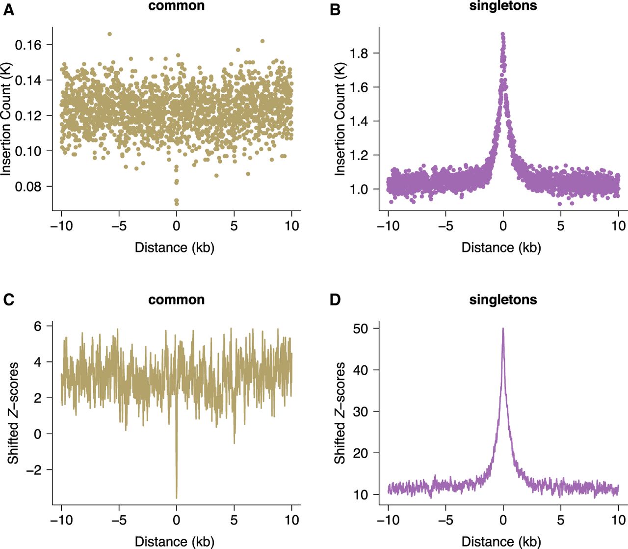 Increased rates of short insertions focused on spermatogonial binding sites. Insertion count (A,B) and shifted Z-scores (C,D) of gnomAD singleton and common insertions (5–20 bp), centered around spermatogonial TFBSs. Singletons are seen only once in the gnomAD V.3 data set (allele frequency ≤ 0.001%) and are significantly enriched at binding sites (P < 10−4); common variants have an allele frequency of at least 5% within gnomAD V.3 and are significantly depleted at binding sites (P < 10−4).