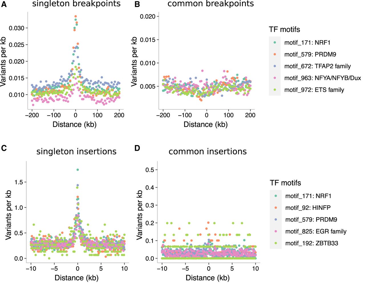 Binding factors associated with the highest rates of mutation at spermatogonial binding sites. Plots are centered on the binding sites of a given motif family inside ATAC-seq footprints. (A,B) Singleton (A) and common (B) deletion breakpoints in the DDD cohort; singletons are breakpoints of deletions with a frequency of ∼0.002% across population samples; common variants are seen at a frequency of at least 1% in the DDD consensus data set. (C,D) Singleton (C) and common (D) insertions (5–20 bp) in the gnomAD data set. Singletons are seen only once in gnomAD V.3 (allele frequency ≤0.001%), and common variants have an allele frequency of at least 5% within gnomAD V.3. Only 10-kb regions around TFBSs with ≥95% unique mappability (umap24 scores) were included. The top five disrupted motifs are shown, listed in order of enrichment of singleton variants in the circular permutations (all enrichments of singletons are associated with P-values < 10−4).