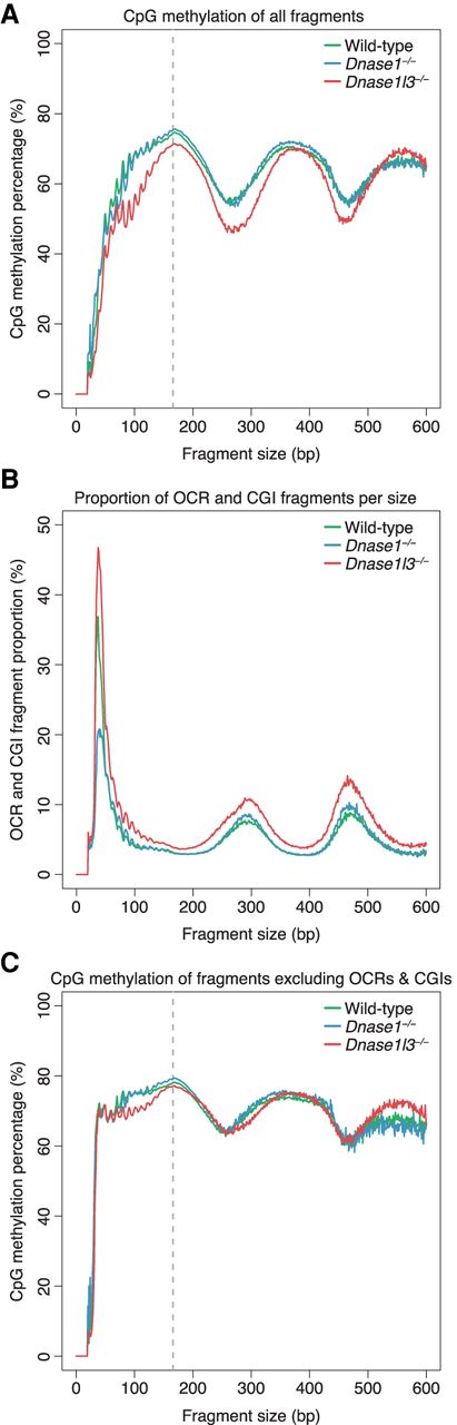 Differential methylation levels by cfDNA fragment size. (A) The CpG methylation percentage was calculated with all fragments of a particular size and the median of each genotype was plotted. A periodic pattern of methylation is shown with peaks in methylation at around 170 bp, 360 bp, and 550 bp, corresponding to sizes associated with mono-, di-, and trinucleosomes. cfDNA from DNASE1L3-deficient mice is hypomethylated from 0 to 500 bp. The y-axis scale ranges from 0% to 100%. (B) The proportion of OCR and CGI fragments within each fragment size was calculated and the median of each genotype was plotted. OCR and CGI fragments are a large proportion of fragments ≤80 bp. cfDNA from DNASE1L3-deficient mice has more OCR and CGI fragments in all fragment sizes while cfDNA from DNASE1-deficient mice has less OCR and CGI fragments in fragments ≤80 bp. The y-axis scale ranges from 0% to 50%. (C) The CpG methylation percentage for each fragment size was replotted after masking OCR and CGI fragments. The hypomethylation of cfDNA from DNASE1L3-deficient mice is diminished after masking in most size ranges, except ∼80–200 bp. The y-axis scale ranges from 0% to 100%. cfDNA from wild-type mice is in green, from DNASE1L3-deficient mice is in red, and from DNASE1-deficient mice in blue. Gray dashed line marks the 166-bp fragment size.