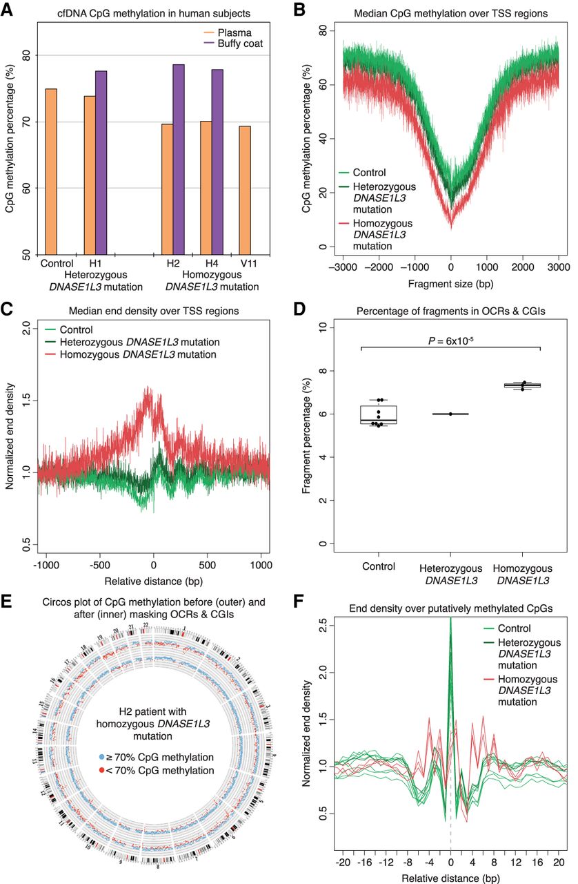 cfDNA from DNASE1L3-deficient patients mimics cfDNA from DNASE1L3-deficient mice. (A) CpG methylation percentage of the human plasma (orange) and buffy coat (purple) samples are shown. H2, H4, and V11 have the homozygous frameshift c.290_291delCA (p.Thr97Ilefs*2) DNASE1L3 mutation, and H1 is the heterozygous parent of H2 and H4. The median value of eight control samples is shown. The y-axis scale is from 50% to 85%. (B) The CpG methylation percentage of fragments from each sample was calculated over the aggregated TSS regions, and the median of each sample type is shown in a ±3000-bp window. cfDNA from DNASE1L3-deficient patients is relatively hypomethylated. The y-axis scale ranges from 0% to 80%. (C) The median normalized end density for each sample type is shown in a ±1000-bp window over the aggregated TSS region. cfDNA from DNASE1L3-deficient patients is more fragmented with more fragment ends in TSS regions. The y-axis scale ranges from 0.5% to 2%. (D) The proportion of fragments in OCR and CGI regions are shown. OCRs are defined as the regions ±500 bp around the center of TSS, H3K4me3, and H3K27ac regions. cfDNA from DNASE1L3-deficient subjects had a significantly increased proportion of OCR and CGI fragments. Welch's t-test was performed between control and DNASE1L3-deficient subjects. The y-axis scale ranges from 0% to 10%. (E) A representative Circos plots from a DNASE1L3-deficient patient showing genome-wide CpG methylation percentages before (outer ring) and after (inner ring) masking OCR and CGI fragments. Each dot represents the CpG methylation percentage in a 1-Mb bin of the mouse autosome and is colored in blue if ≥70% and in red if <70%. Masking OCR and CGI fragments diminishes the genome-wide hypomethylation in the cfDNA of DNASE1L3-deficient patients. (F) Normalized end density over putatively methylated CpGs is shown in a ±20-bp window. The identified C is placed at position 0. In control and heterozygous DNASE1L3 samples, there is a distinct preference to cut at the methylated CpG, which is lost in DNASE1L3-deficient patients. The y-axis scale ranges from 0% to 2.5%. cfDNA from control samples is in light green, the heterozygous DNASE1L3 parent is in dark green, and DNASE1L3-deficient subjects is in red.