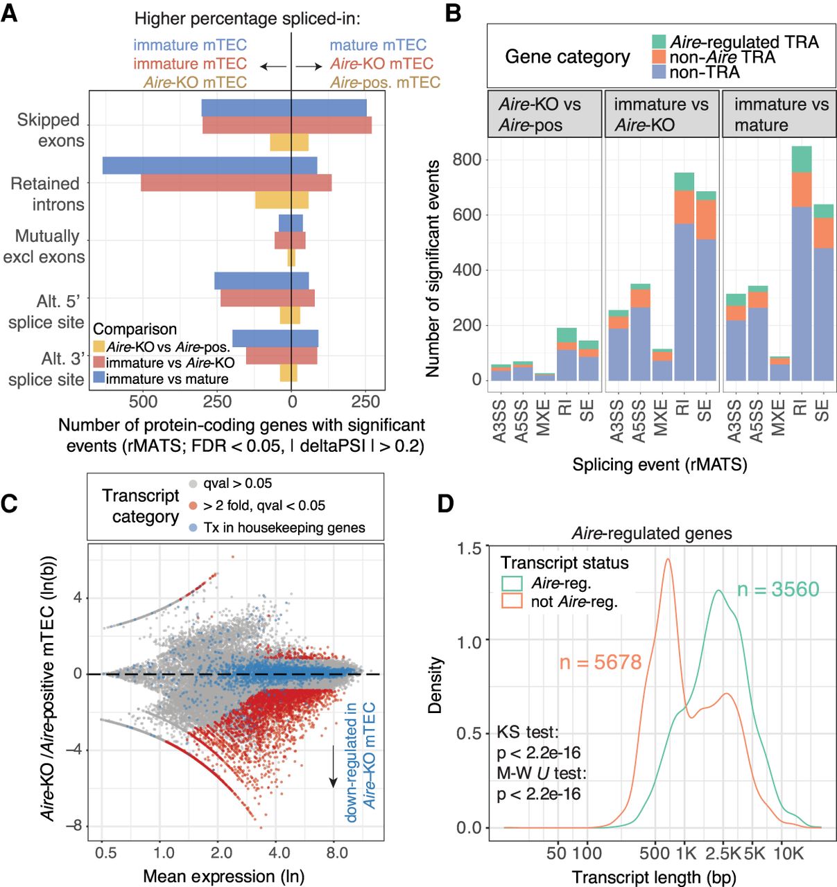Aire promotes the generation of long transcripts in TEC. (A) The numbers of protein-coding genes (x-axis) in which significant differential splicing events (y-axis) were detected; comparisons of immature versus mature mTEC (blue), immature mTEC versus Aire-knockout mTEC (red) and Aire-knockout versus Aire-positive mature mTEC (yellow) (n = 2 replicates per sample). (B) Breakdown of identified splicing events by event type and promiscuous expression status. (SE) skipped exon; (RI) retained intron; (MXE) mutually exclusive exon; (A3SS/A5SS) alternative 3′/5′ splice site. (C) MA plot of differential transcript expression in Aire-knockout compared to Aire-positive mTEC. Transcripts regulated by Aire are shown in red (sleuth, Wald test, Qval < 0.05, fc ≳ 2, n = 2 replicates per sample). Transcripts from housekeeping genes are shown in blue. (D) The length distributions of Aire-regulated and non-Aire-regulated transcripts in Aire-regulated genes (analysis limited to genes that contained at least one significantly Aire-regulated transcript as defined in C).